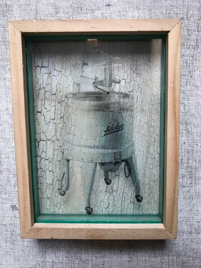 オリジナルのアートワークです。 昭和初期の古い洗濯機をモチーフにしています。 タイトル:フロー05 イリュージョン(幻想) サイズ:158×118(mm) 素材:ミクストメディア(木、ガラス、写真を転写した透明フィルム) お気軽に壁に飾って頂ける小品です。 正面がガラス板になっていますので、落下等の衝撃には弱いです。