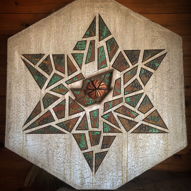 オリジナルのアートワークです。 六芒星をモチーフにした作品です。 2014年頃に制作しました。 タイトル:マスターピース サイズ:高さ800 × 幅750 × 奥行40 (mm) 素材:木、布、他 80cm×75cmの大き目の作品。 壁に立て掛けたり、フック等で吊り下げて飾って頂けるオブジェです。 幸運を呼ぶ六芒星。 エイジング加工を施し、アンティーク感溢れる仕上がりになっております。