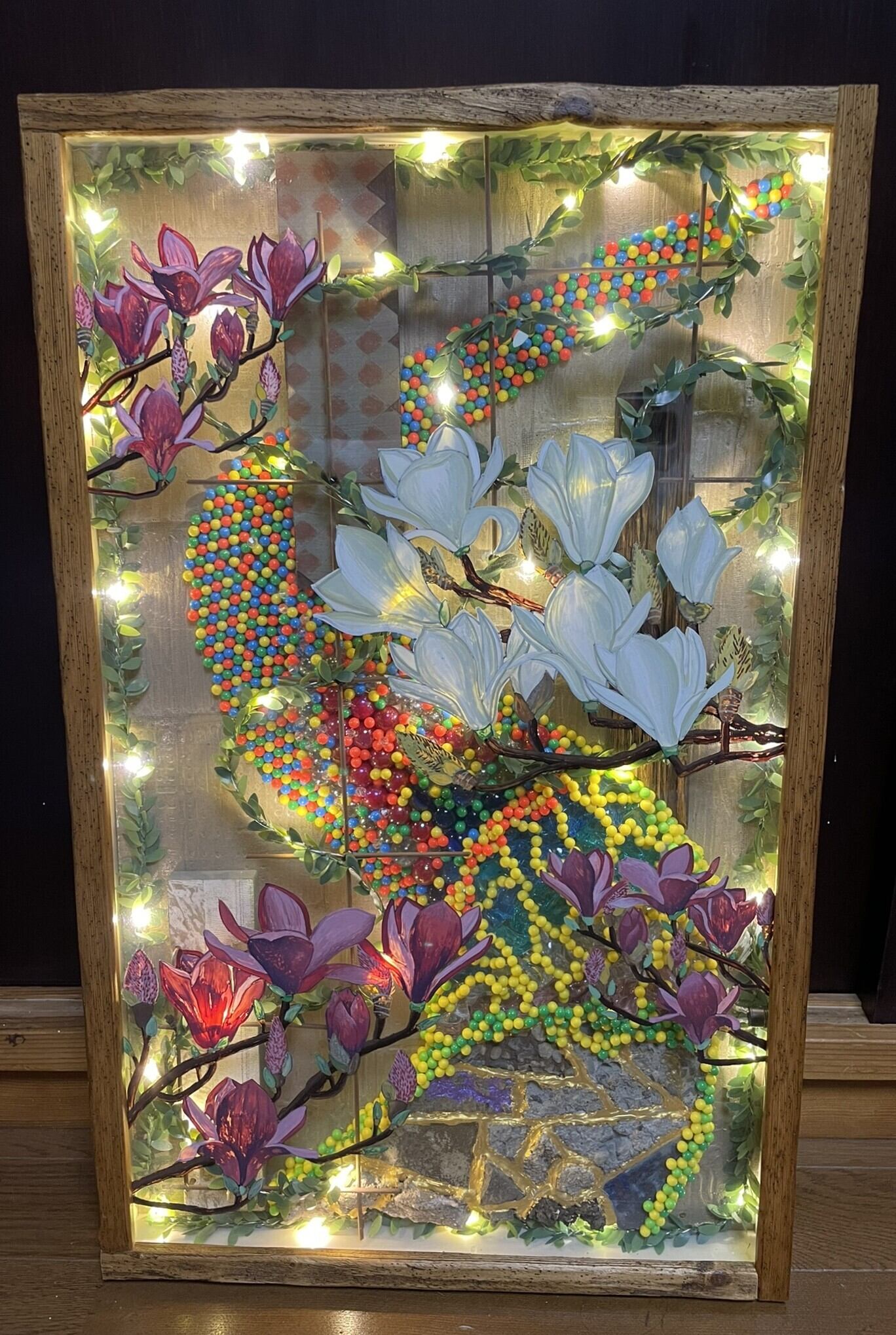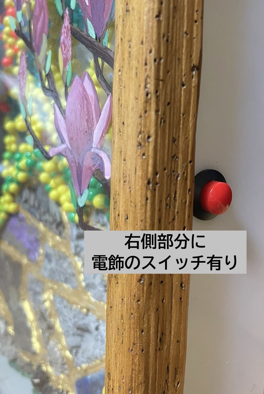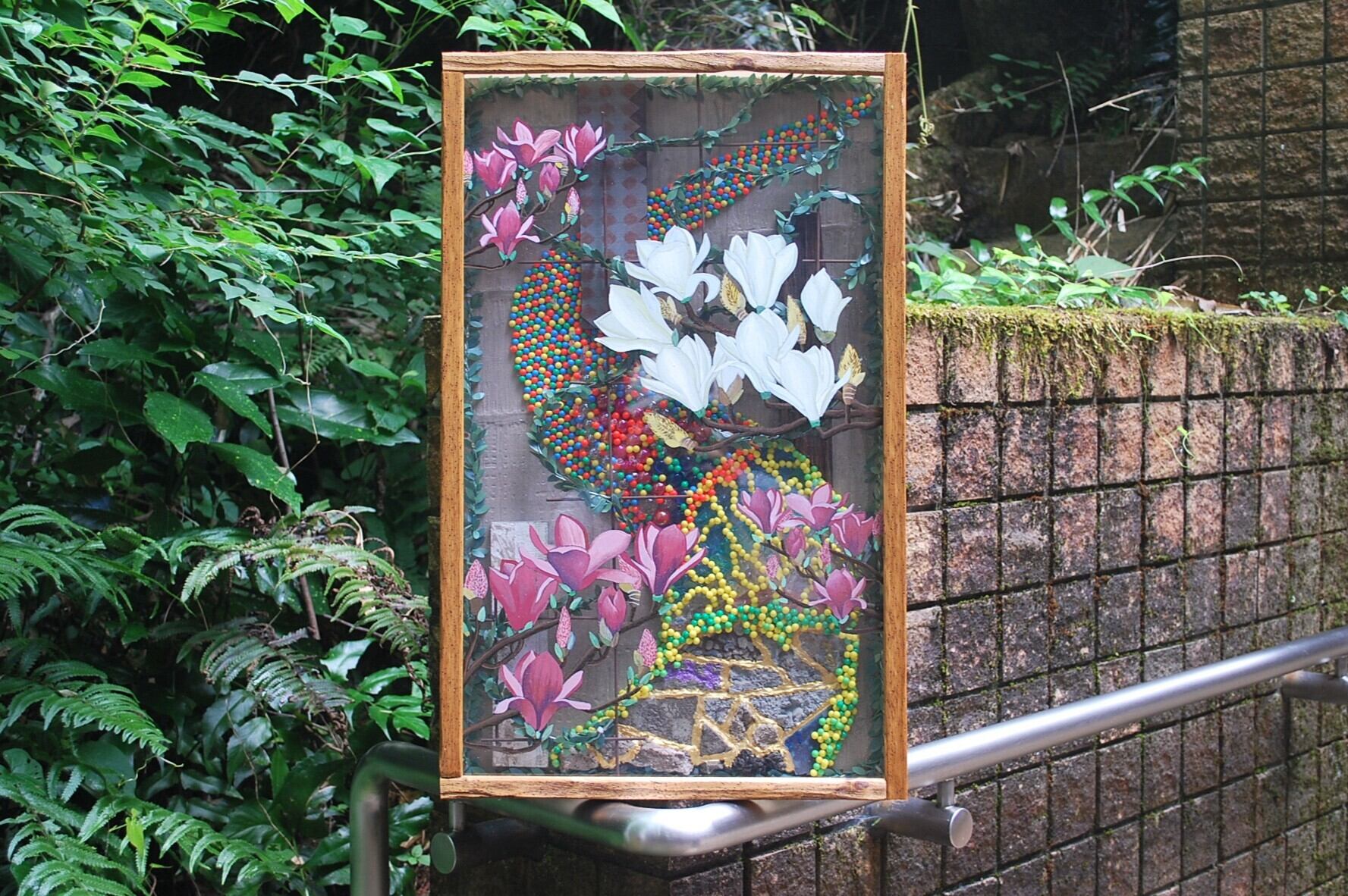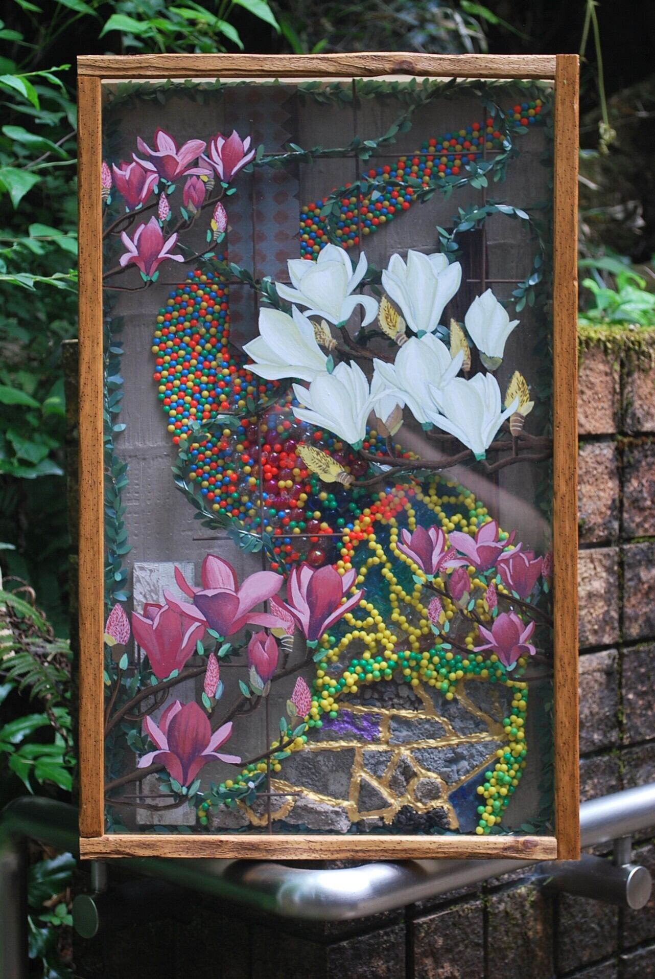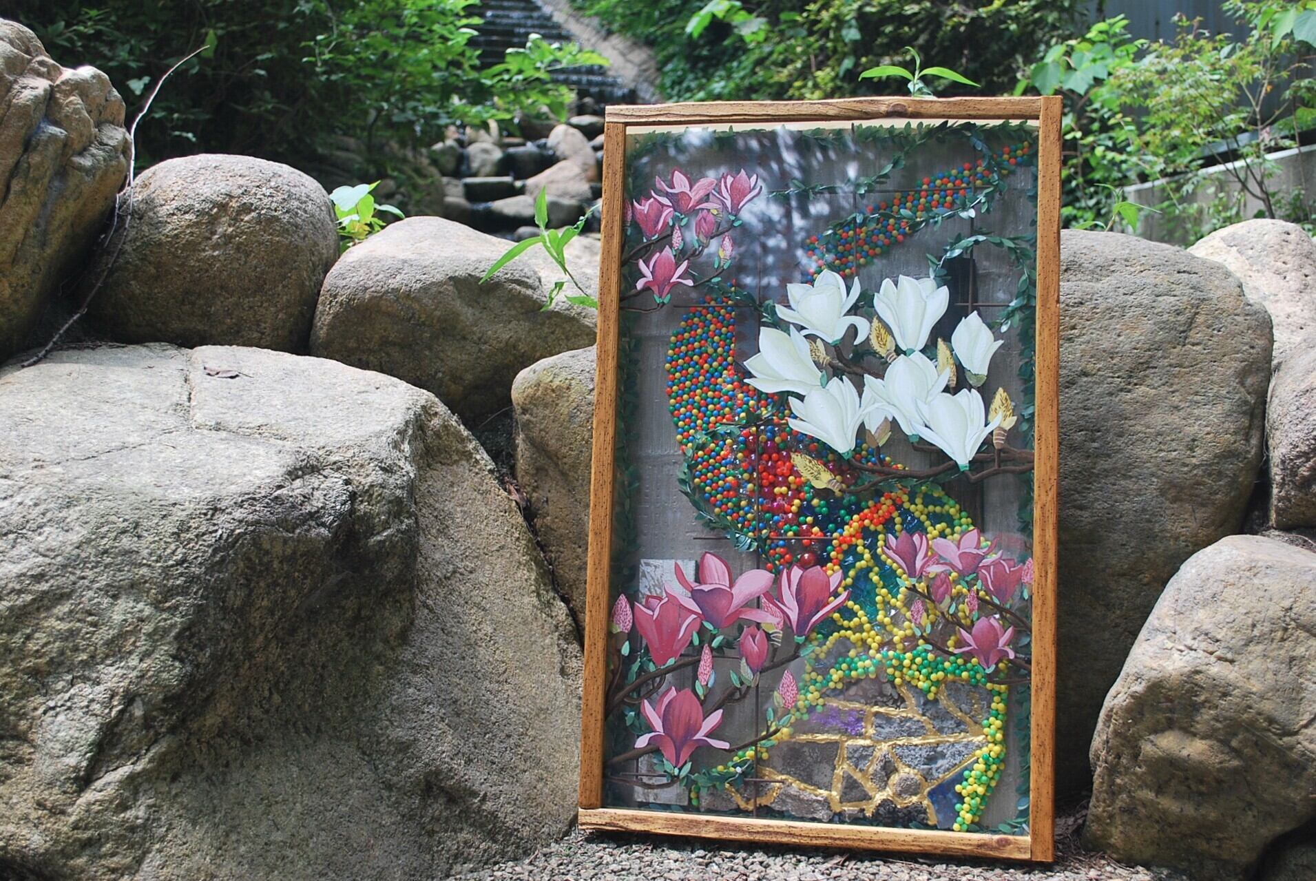 この作品は、木蓮の美しい花をテーマにしています。精緻なアクリルの重ね合わせにより、花びらの透明感と温かみを表現しました。手仕事による丁寧なペイントが施されており、心に残る情景を描き出しています。