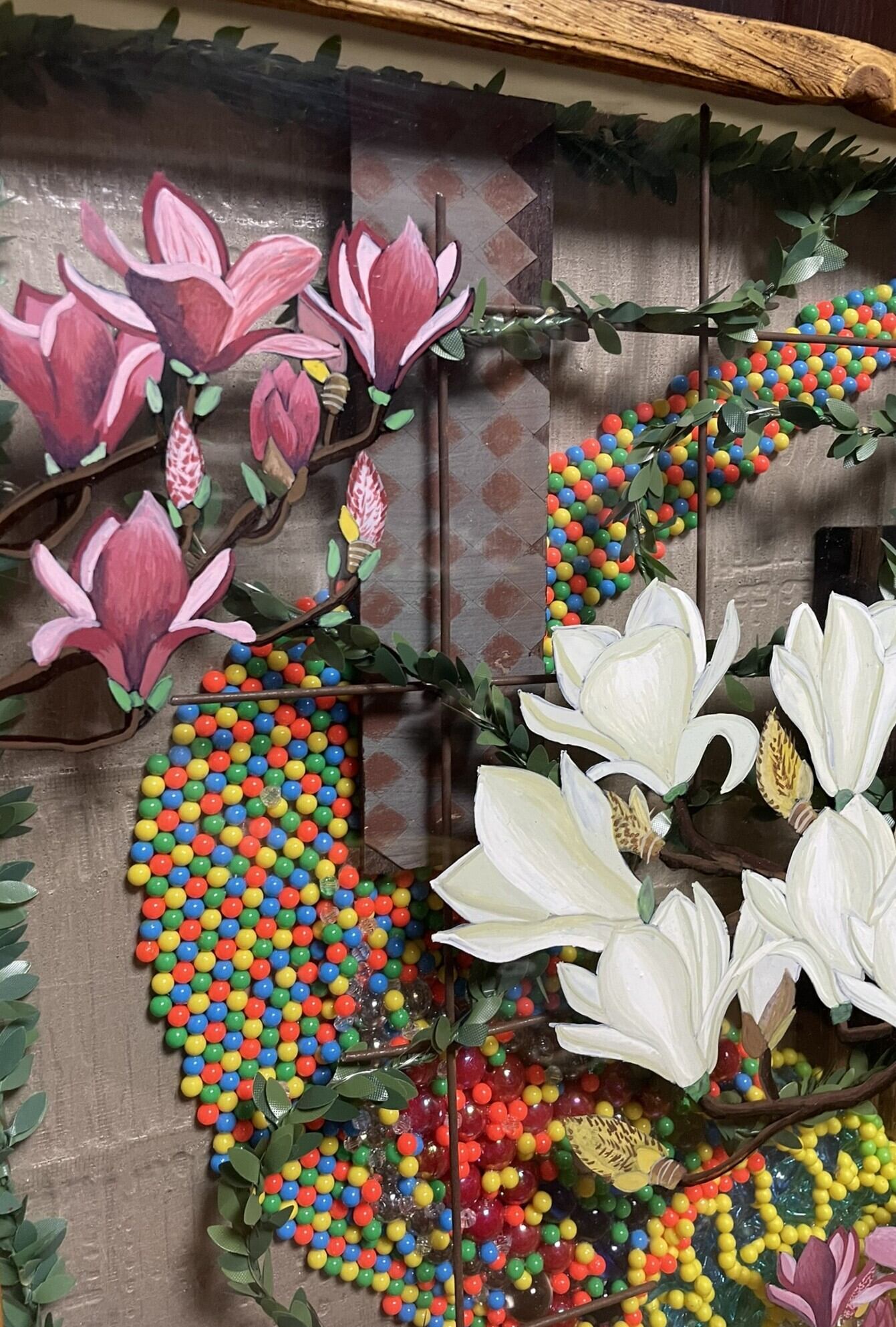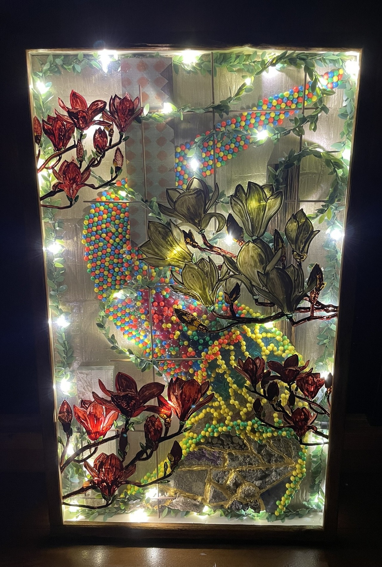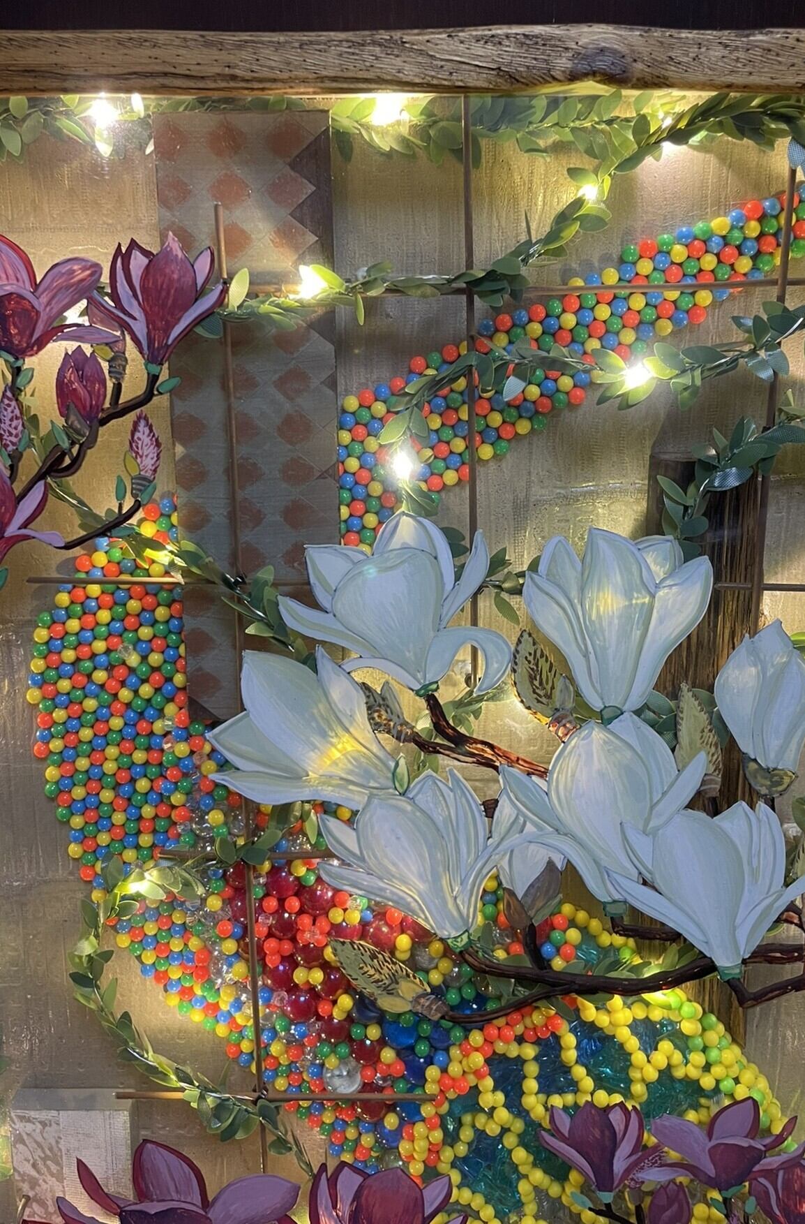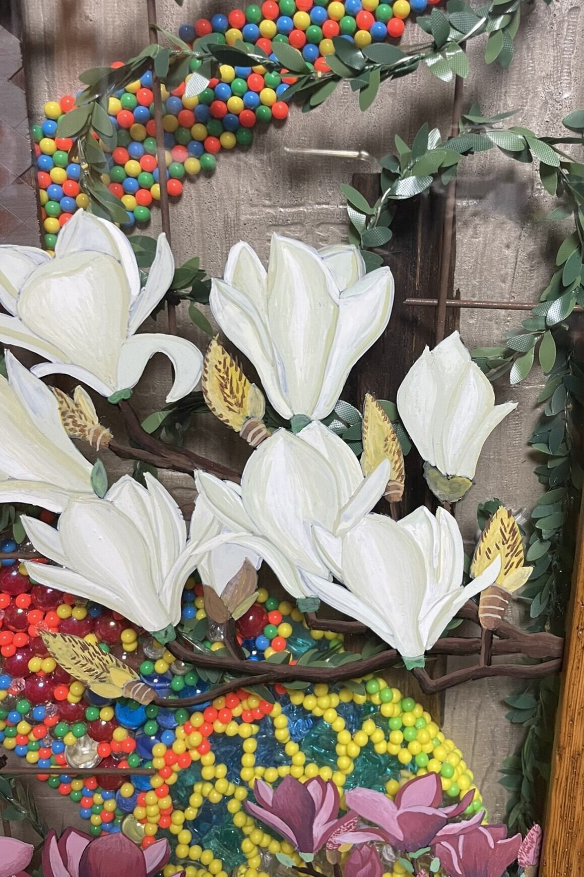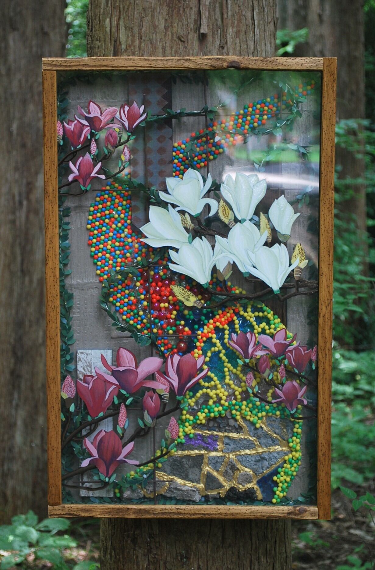 この作品は、木蓮の美しい花をテーマにしています。精緻なアクリルの重ね合わせにより、花びらの透明感と温かみを表現しました。手仕事による丁寧なペイントが施されており、心に残る情景を描き出しています。