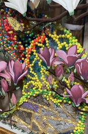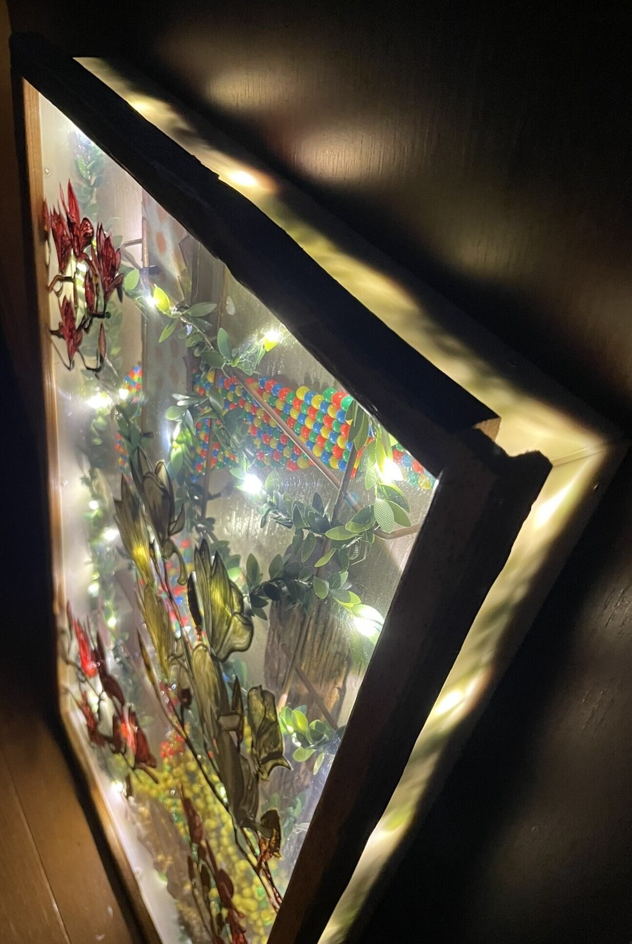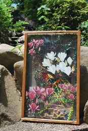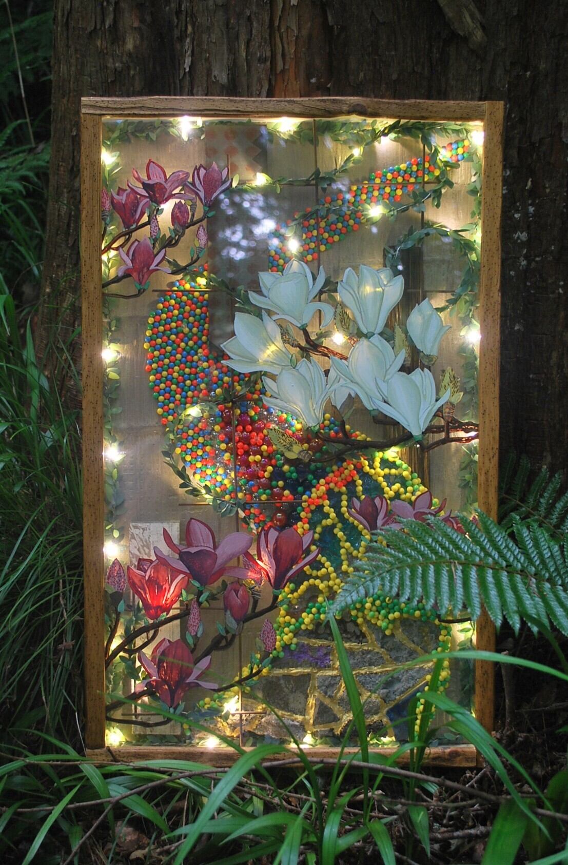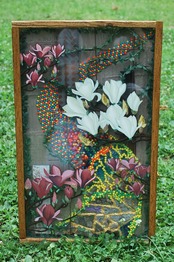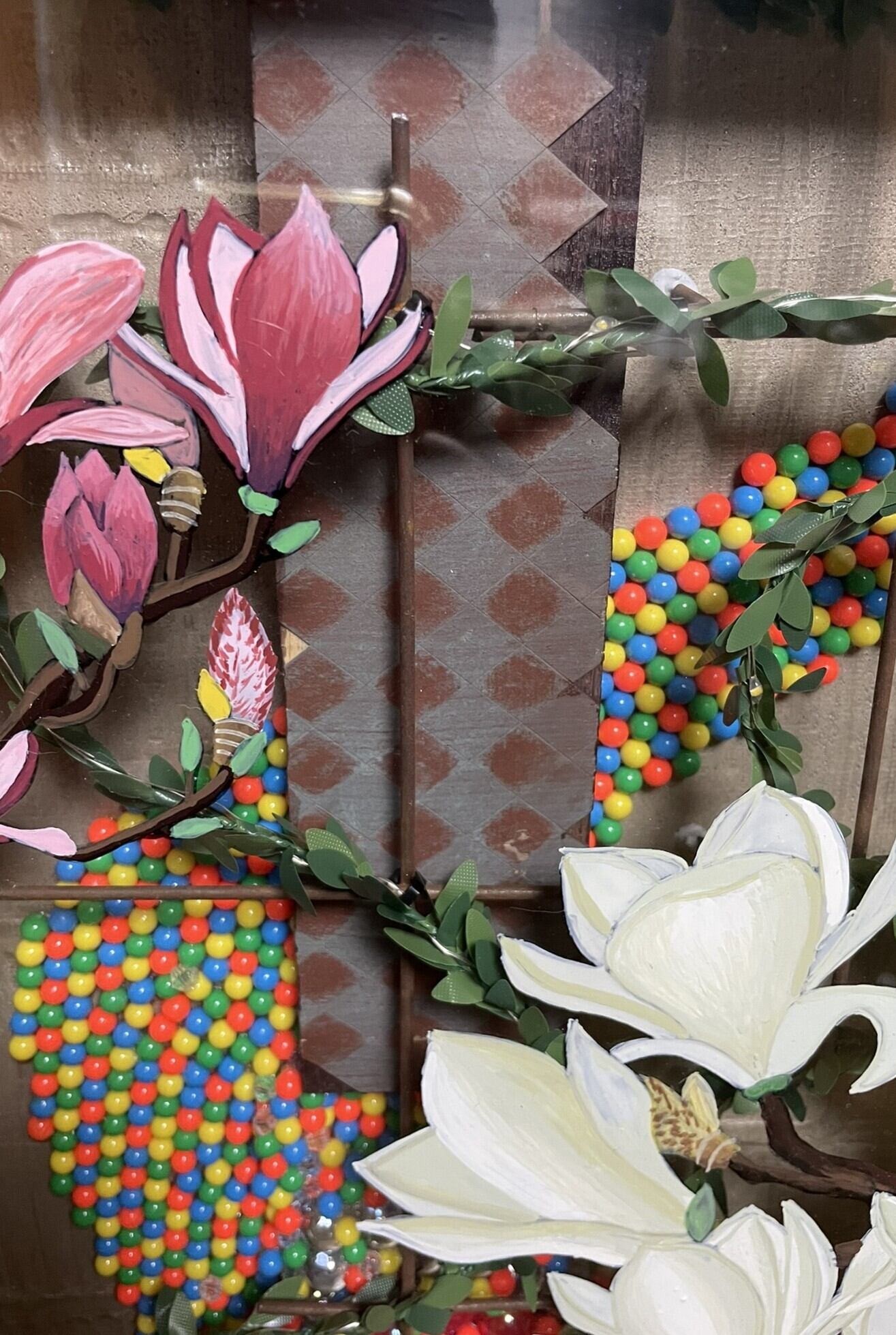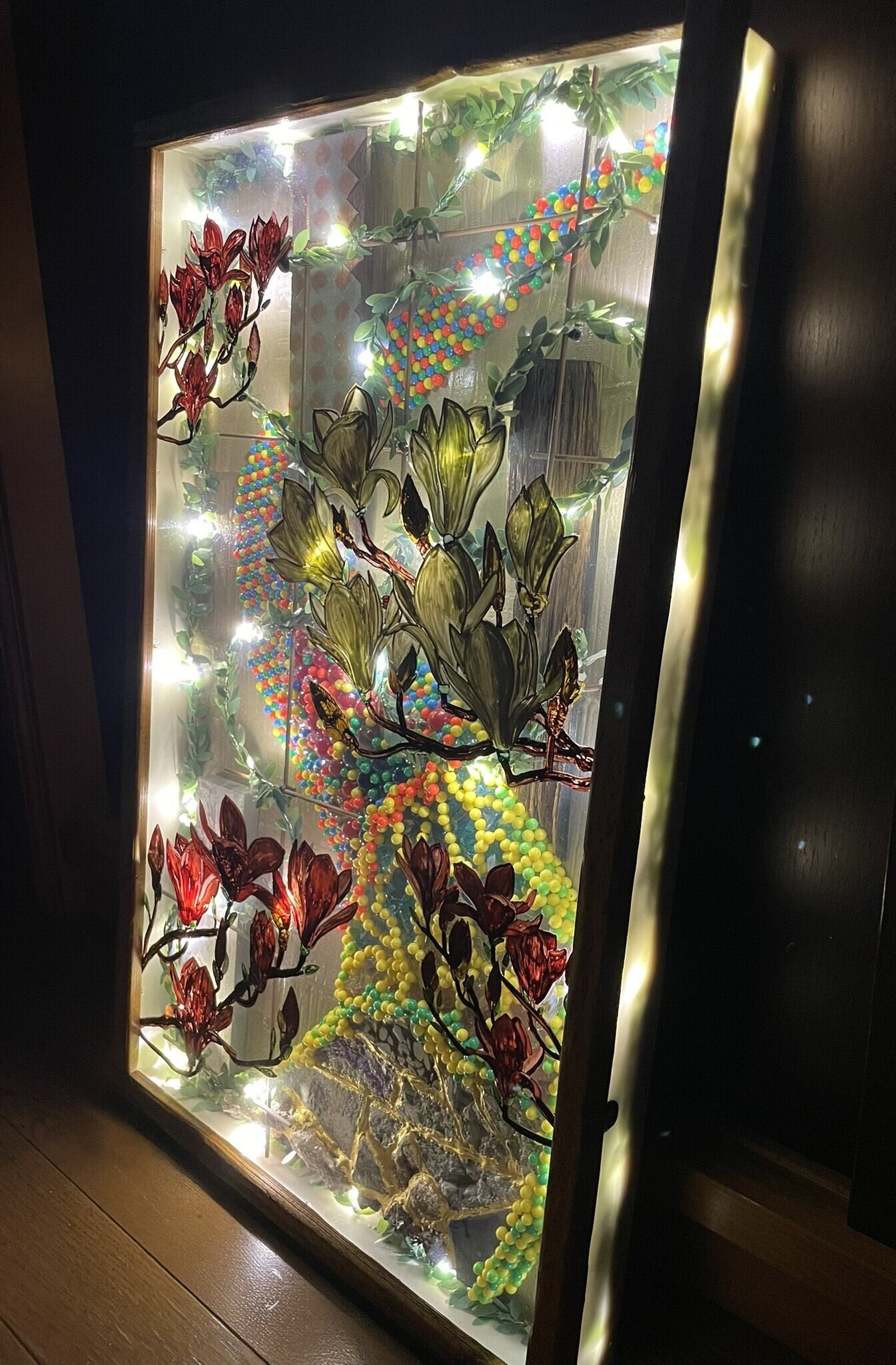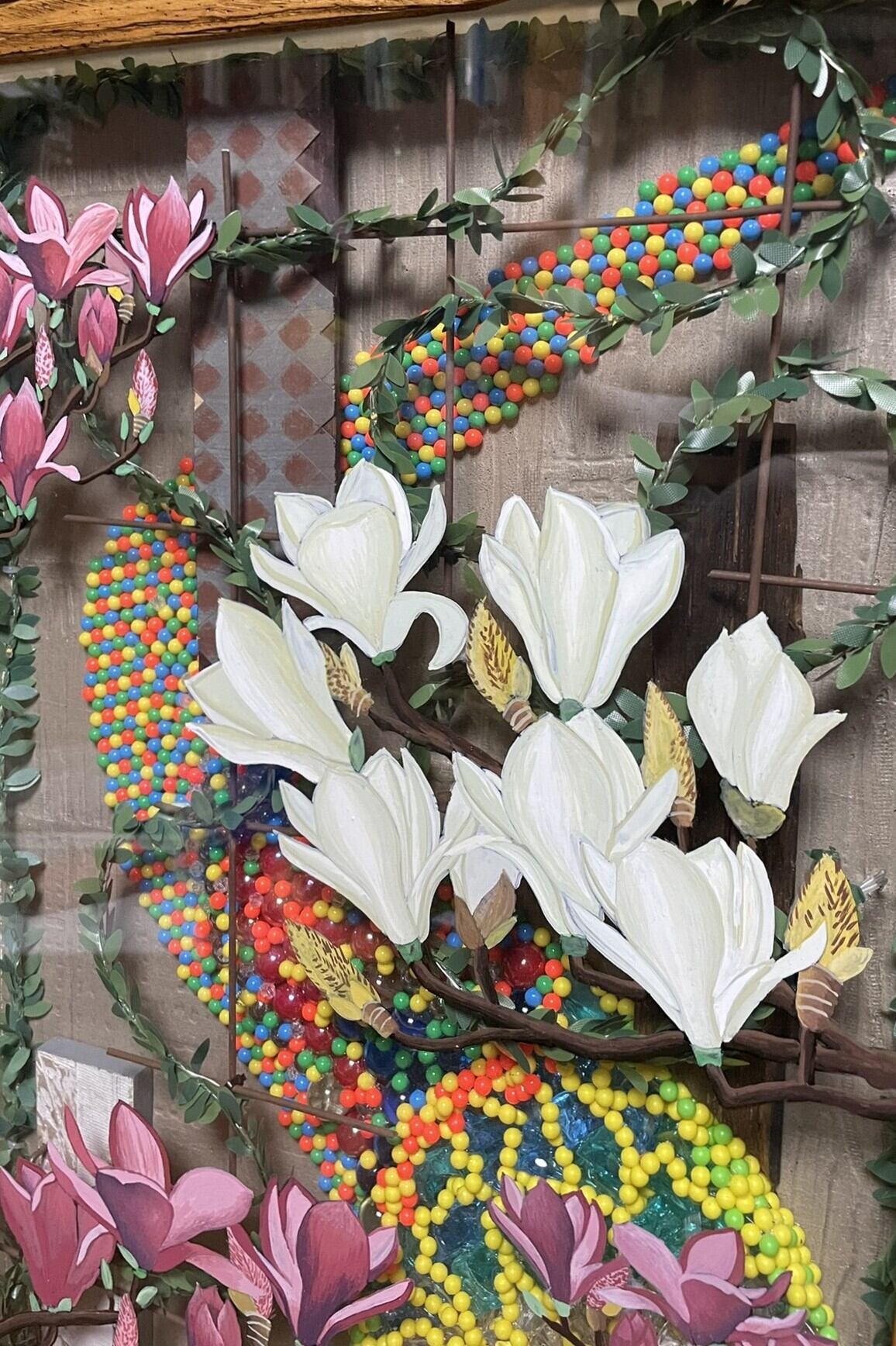 この作品は、木蓮の美しい花をテーマにしています。精緻なアクリルの重ね合わせにより、花びらの透明感と温かみを表現しました。手仕事による丁寧なペイントが施されており、心に残る情景を描き出しています。