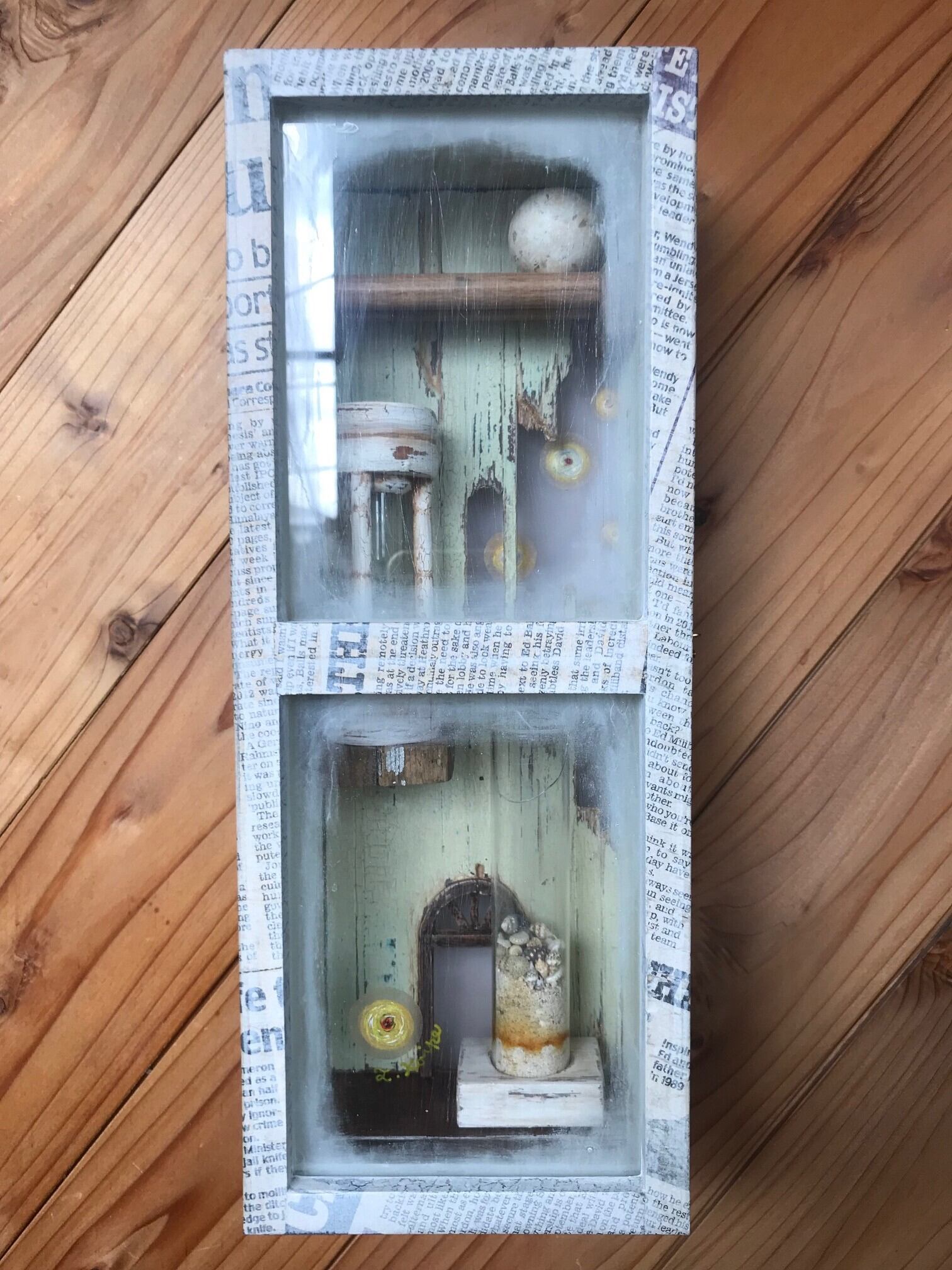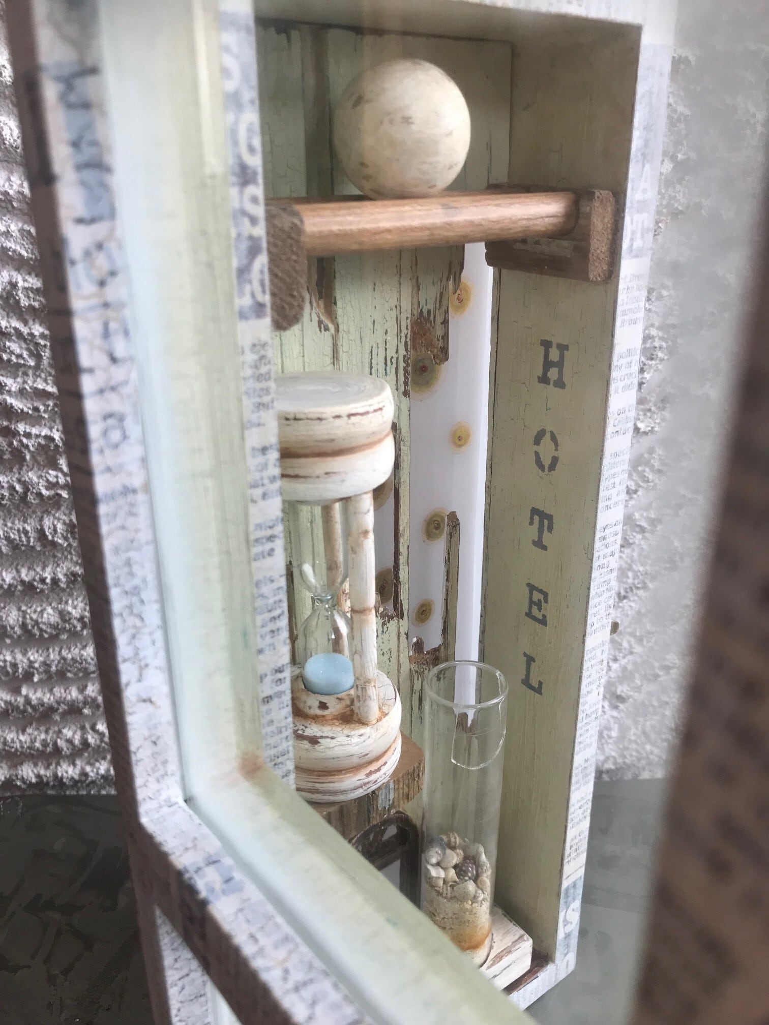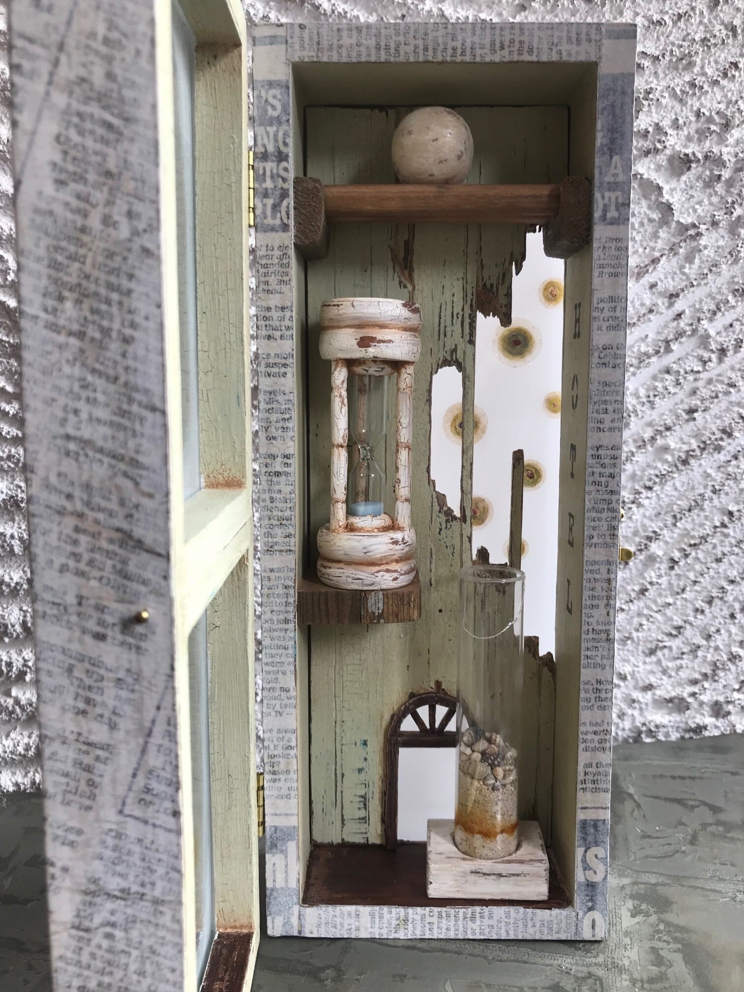 素材:木、アクリル板、ガラス、砂時計、砂、貝殻、新聞紙、ペイントした透明フィルム