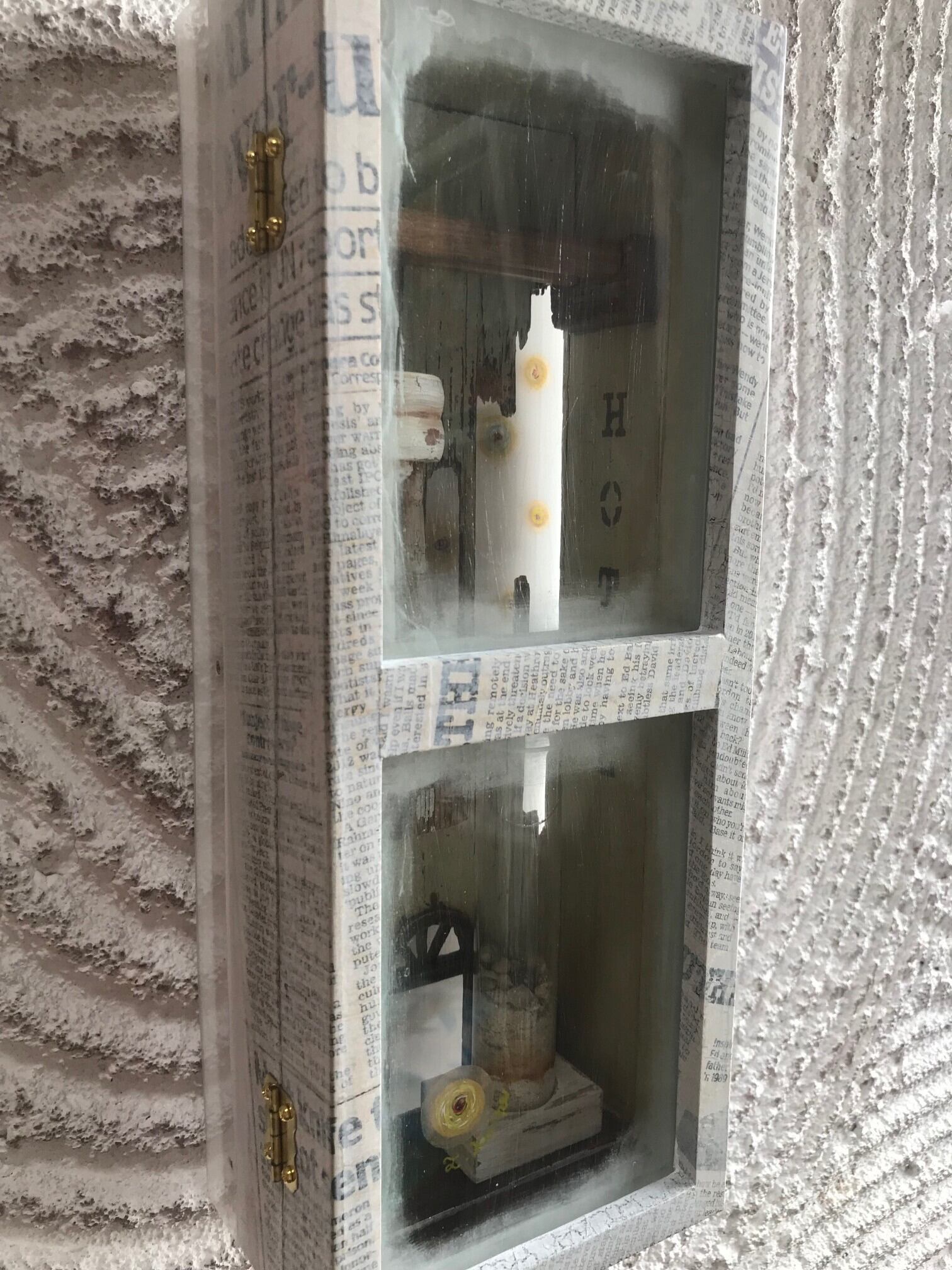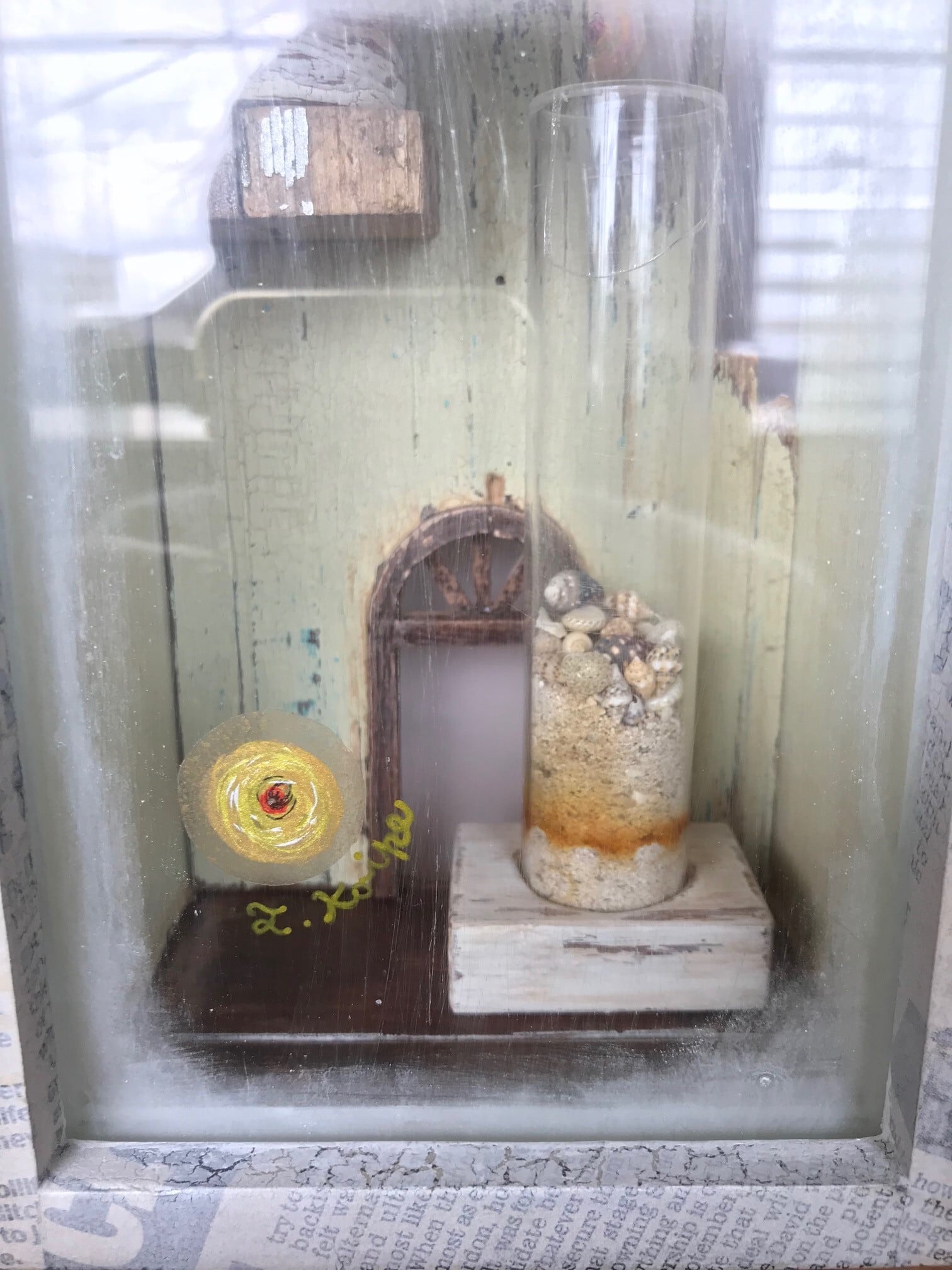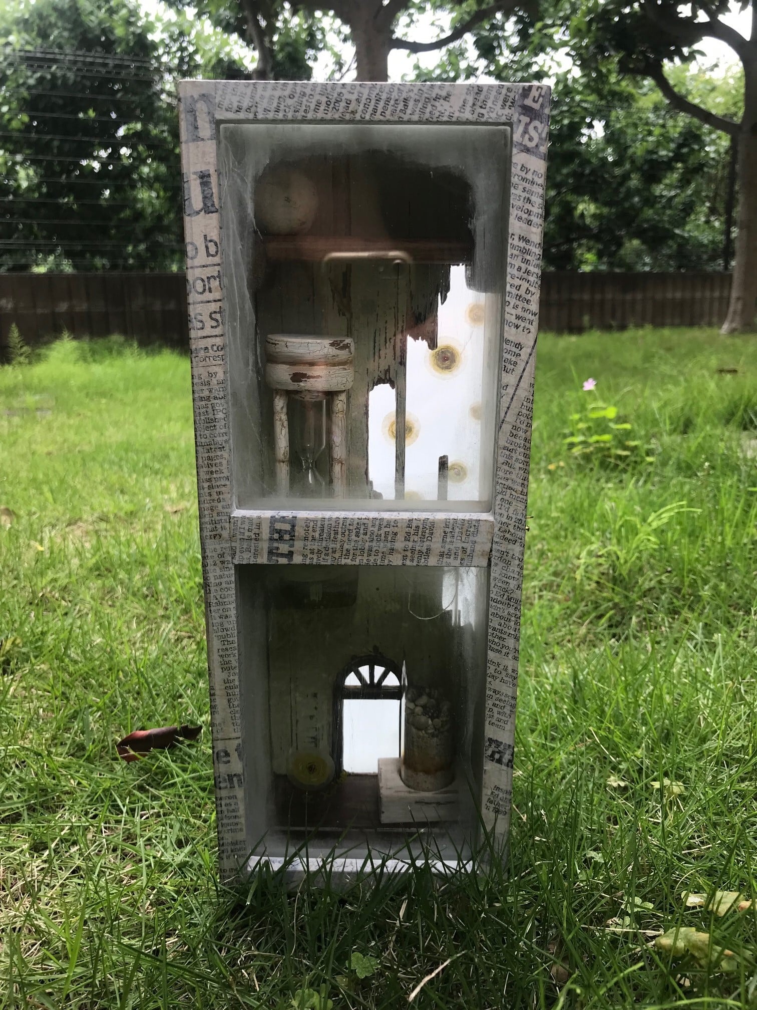 素材:木、アクリル板、ガラス、砂時計、砂、貝殻、新聞紙、ペイントした透明フィルム