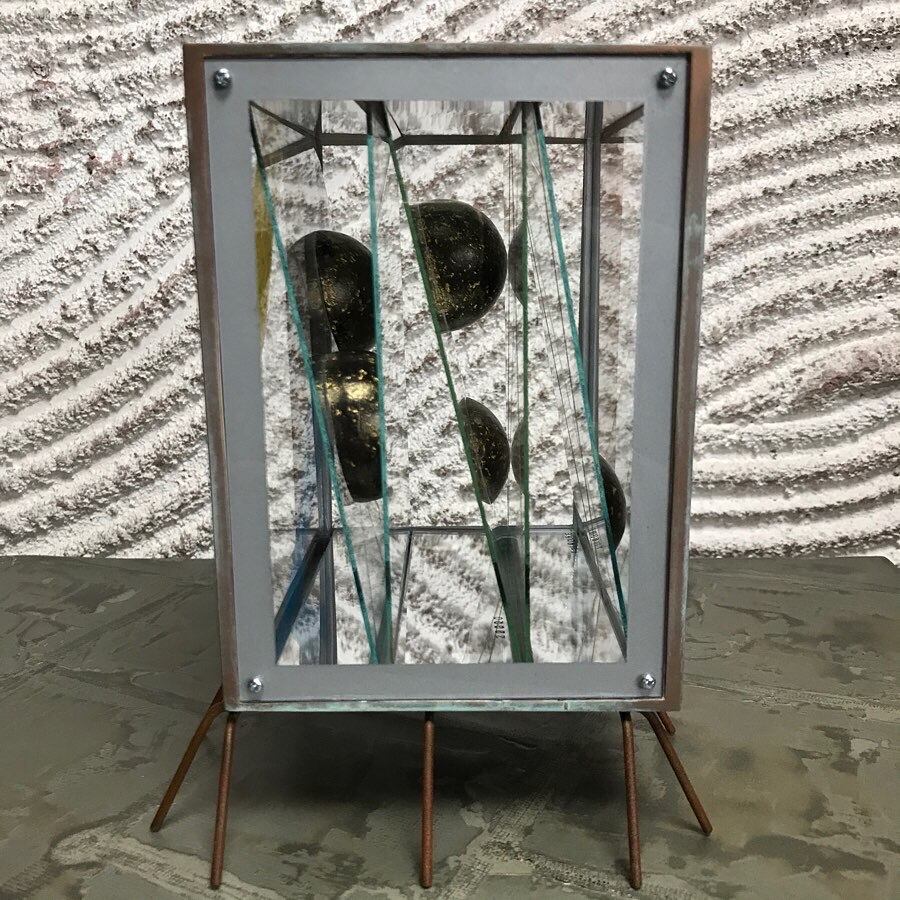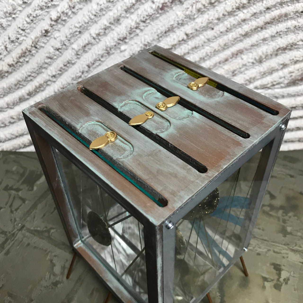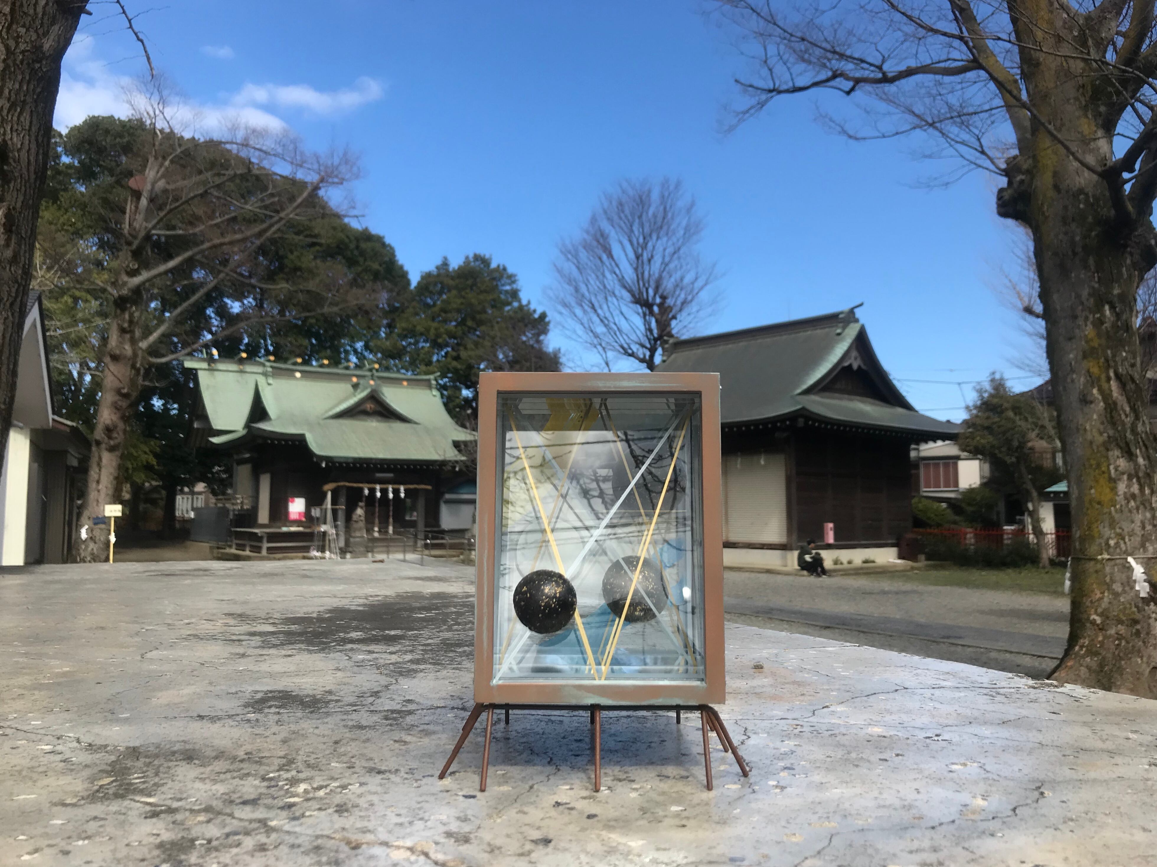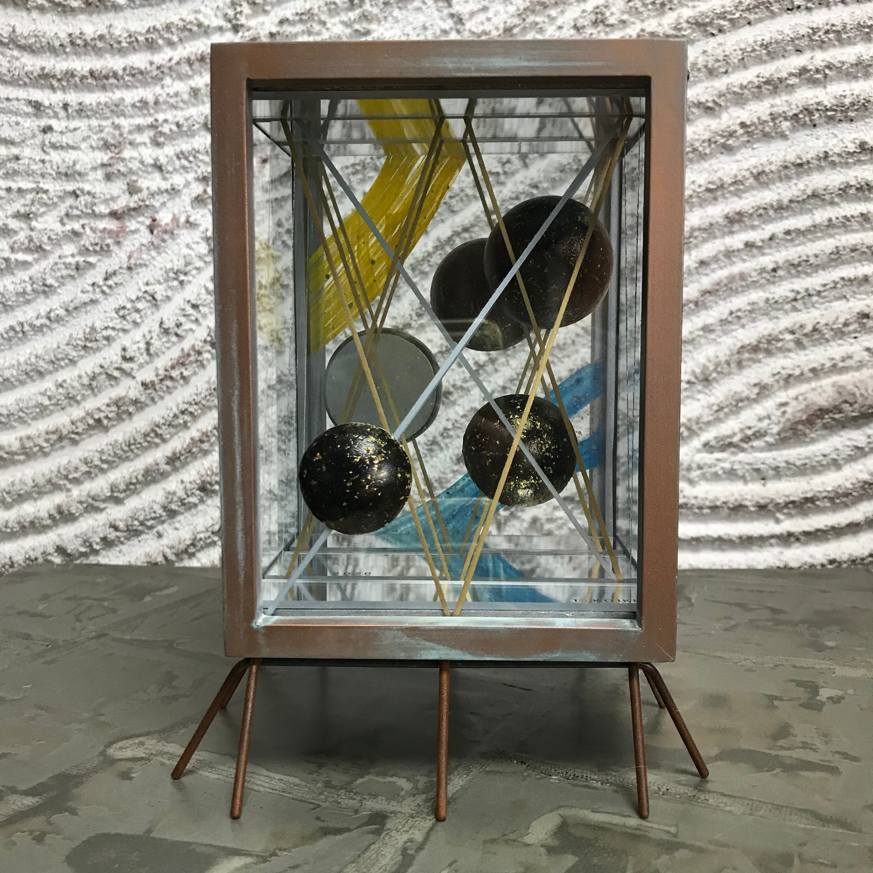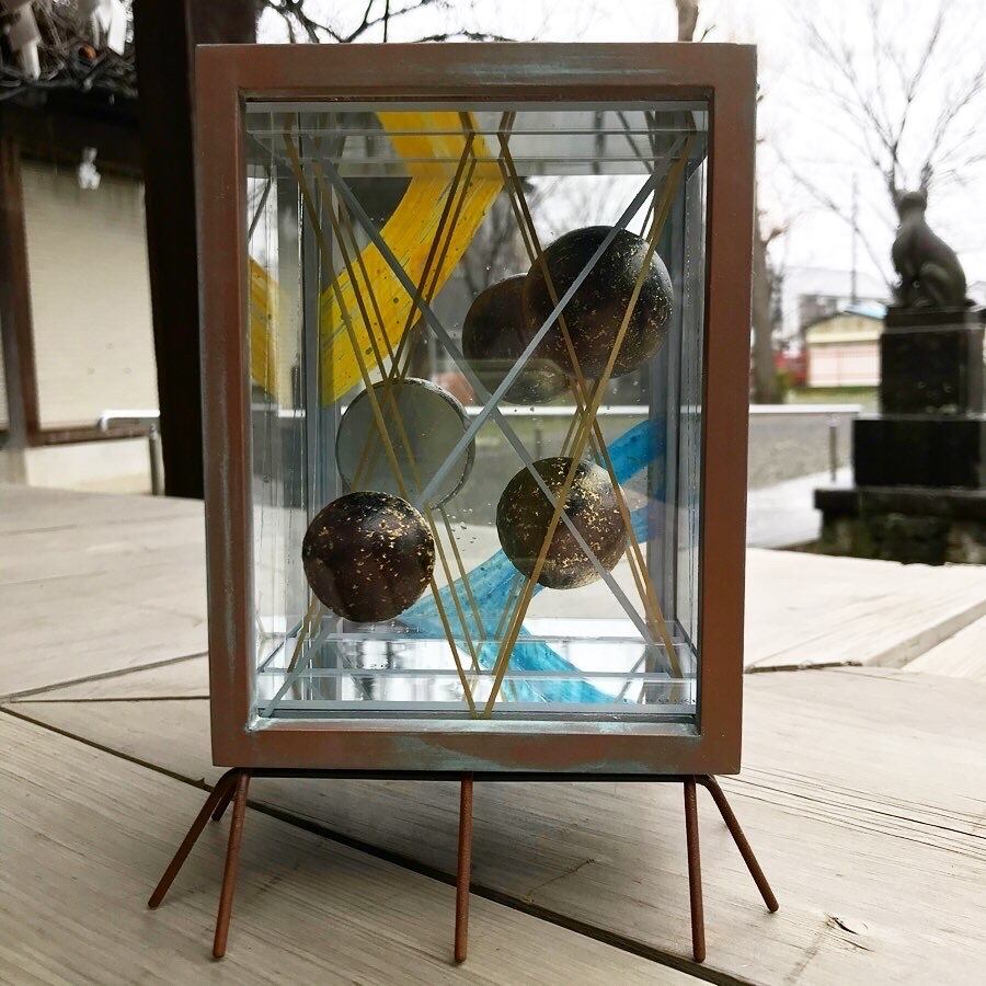 素材:木、鉄、ガラス、コルク球、アクリル板(鏡)、ペイントした透明フィルム、ほか