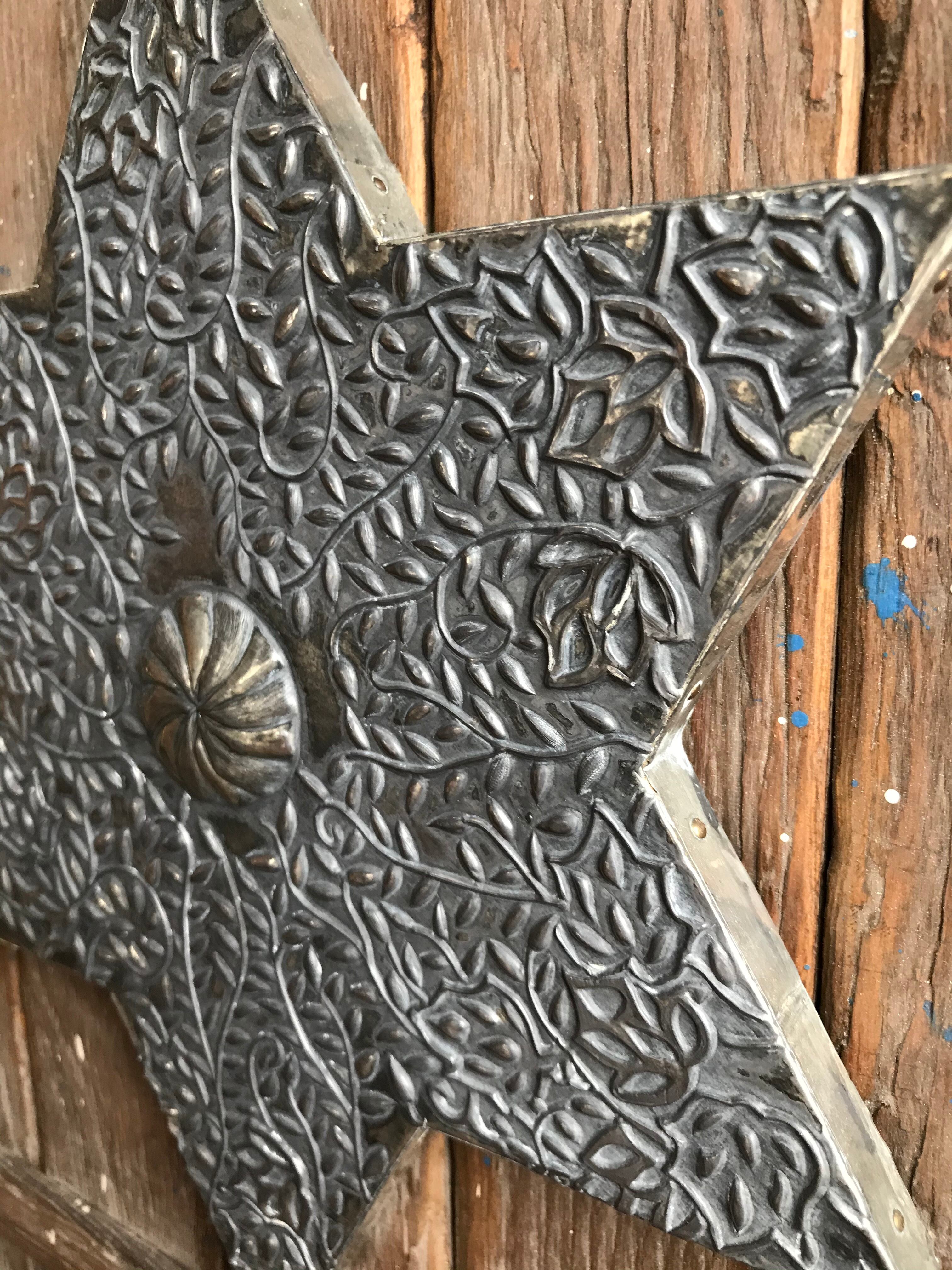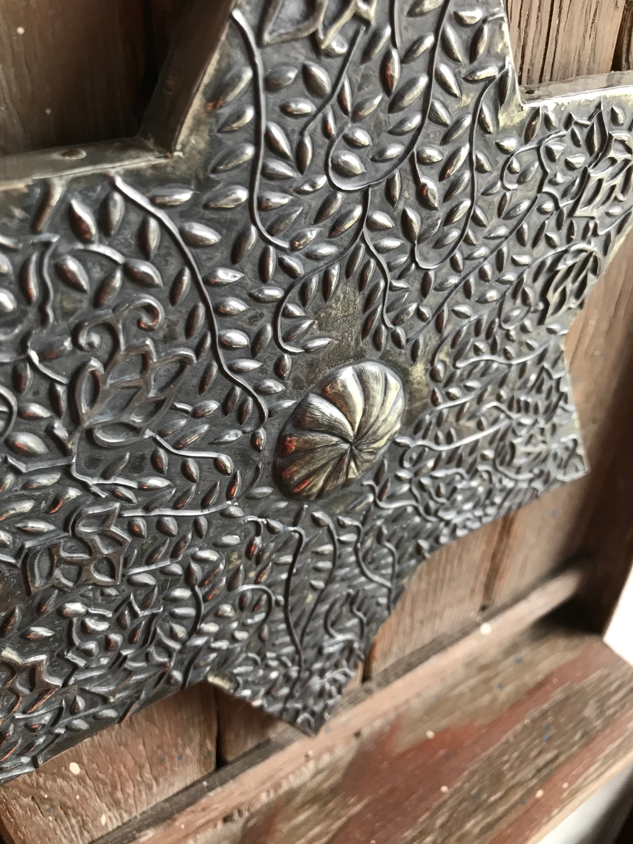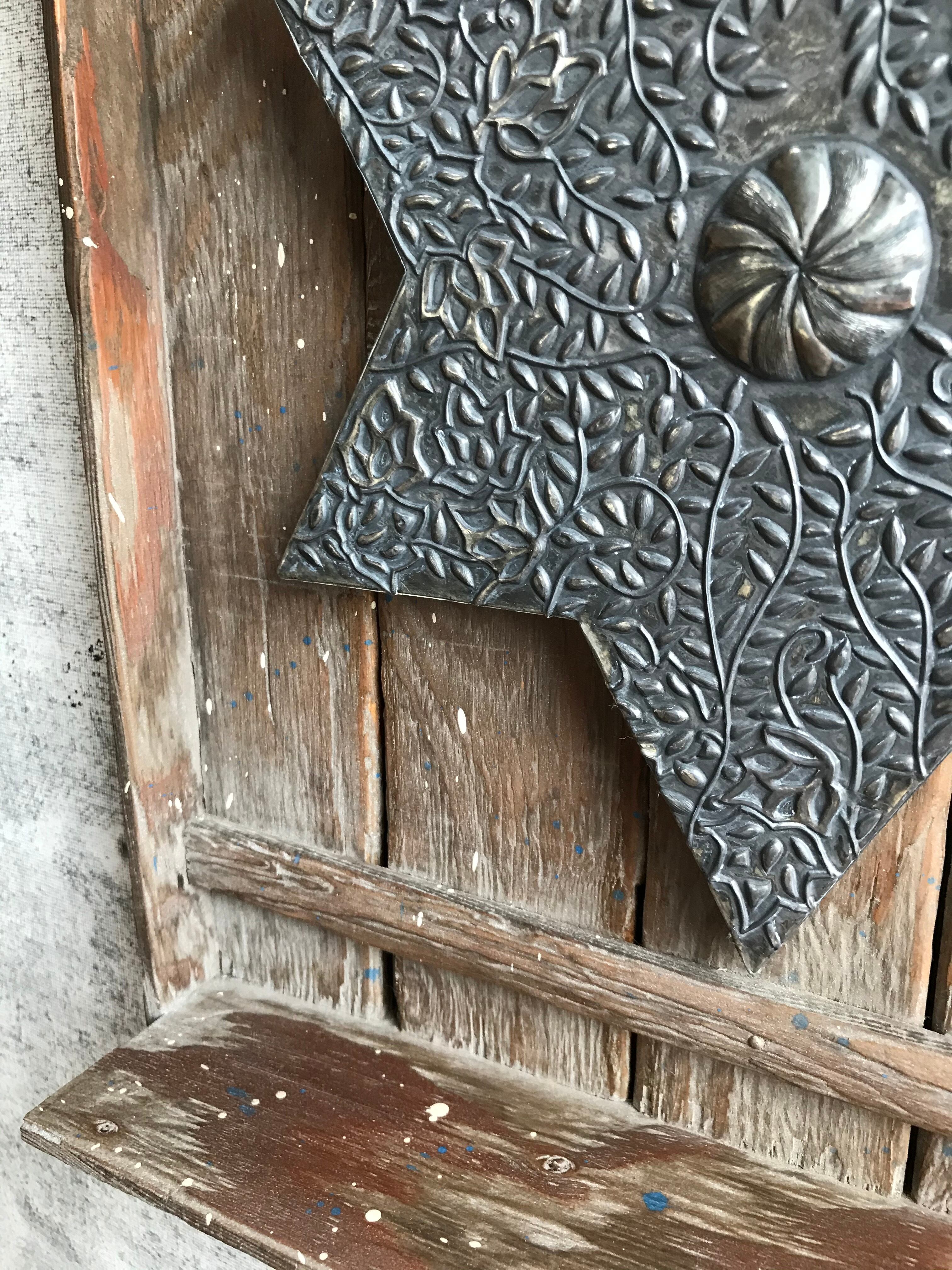 中央に鎮座する六芒星はメタルエンボッシングという金属工芸の技法を用いました。亜鉛合金のシートに専用の工具を押さえつけて模様を盛り上がらせています。