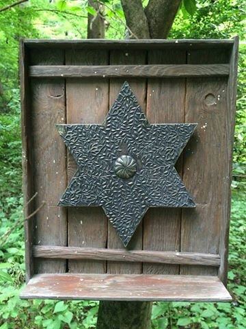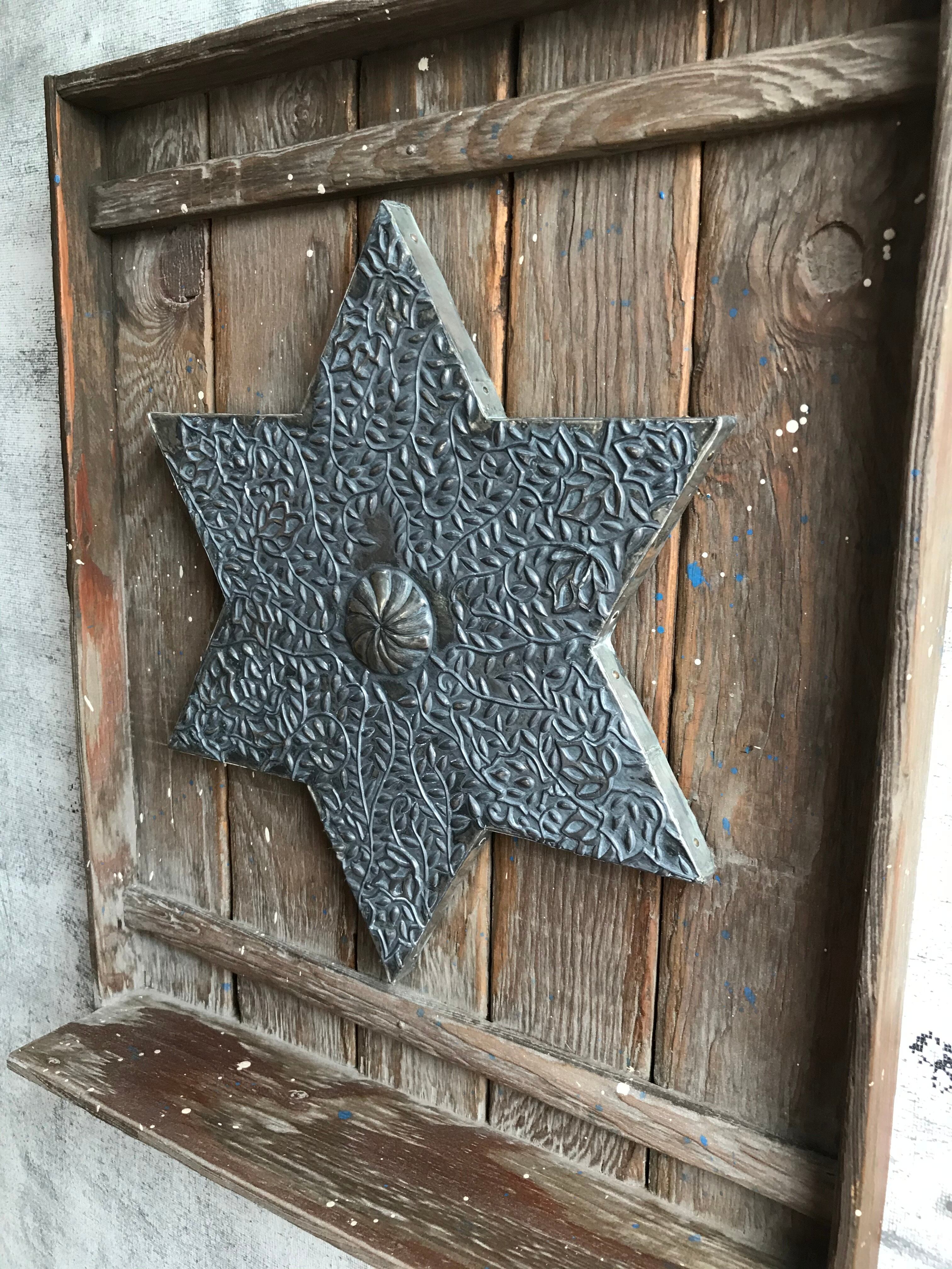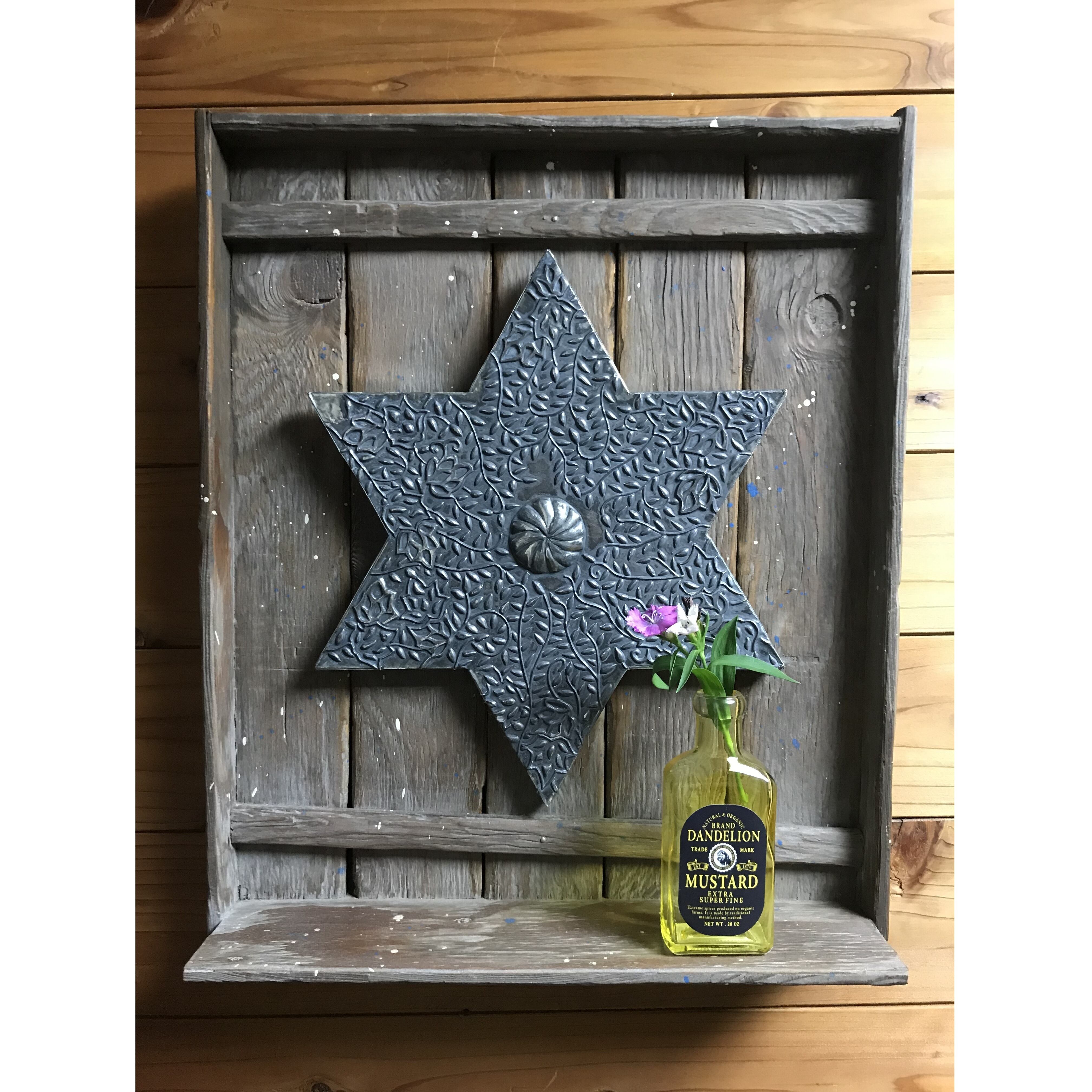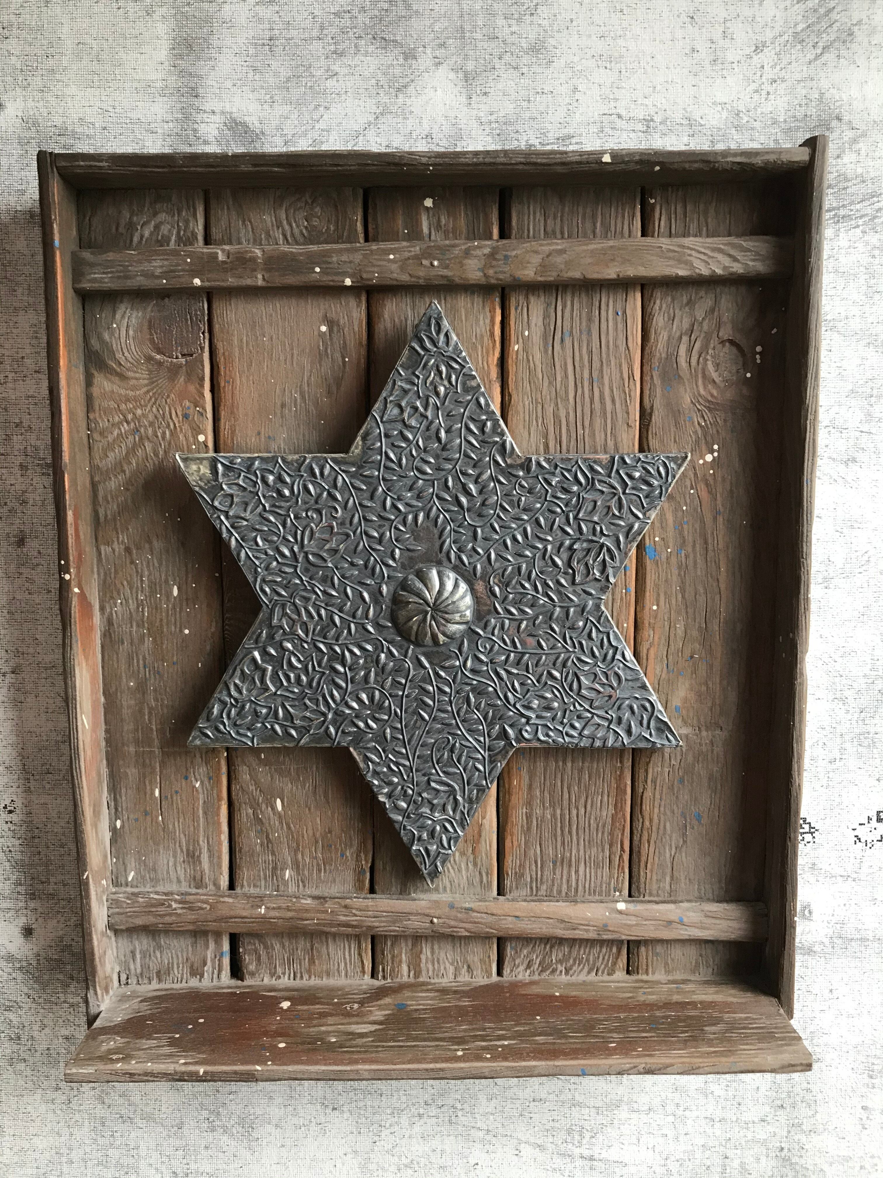 中央に鎮座する六芒星はメタルエンボッシングという金属工芸の技法を用いました。亜鉛合金のシートに専用の工具を押さえつけて模様を盛り上がらせています。