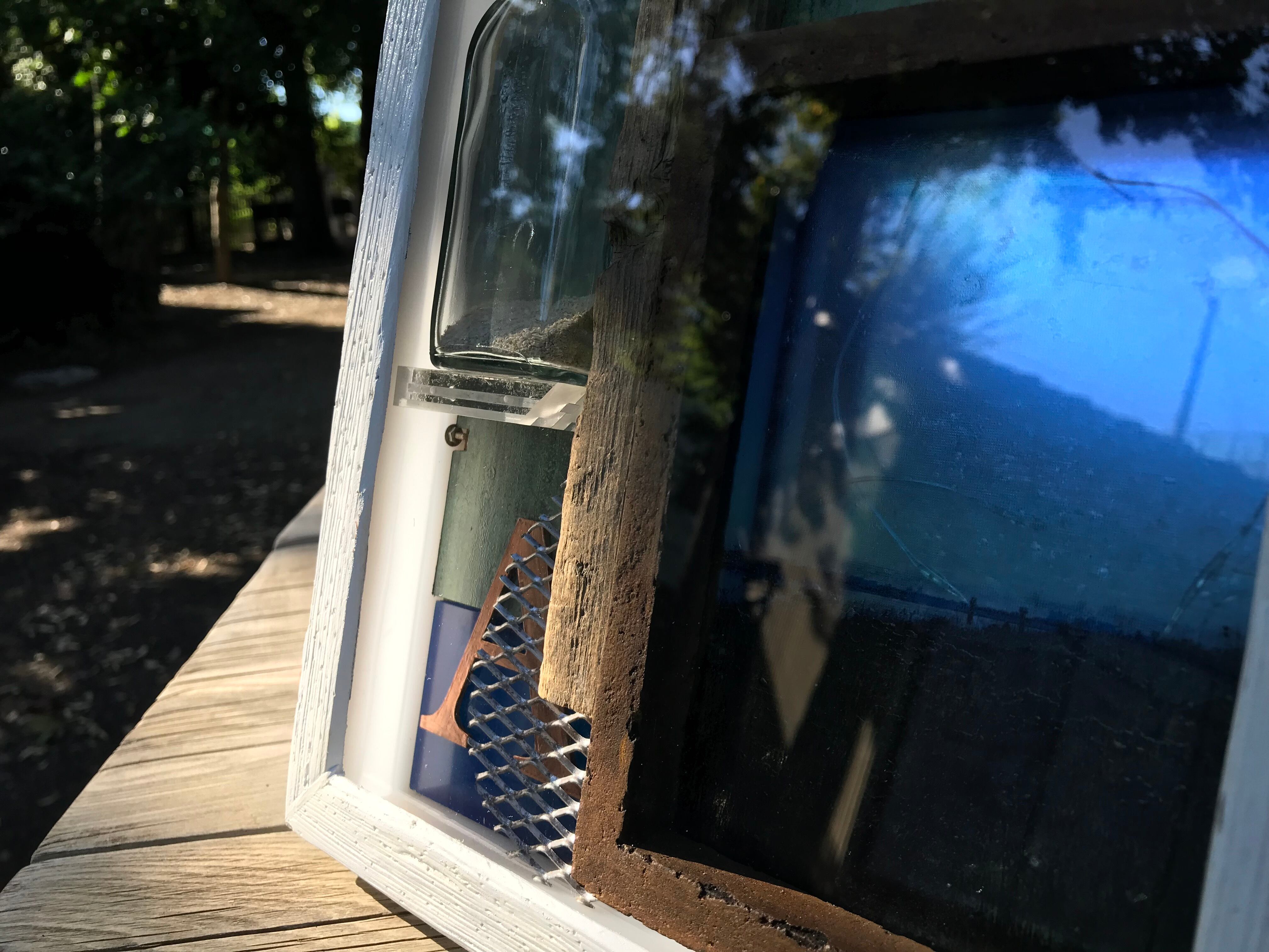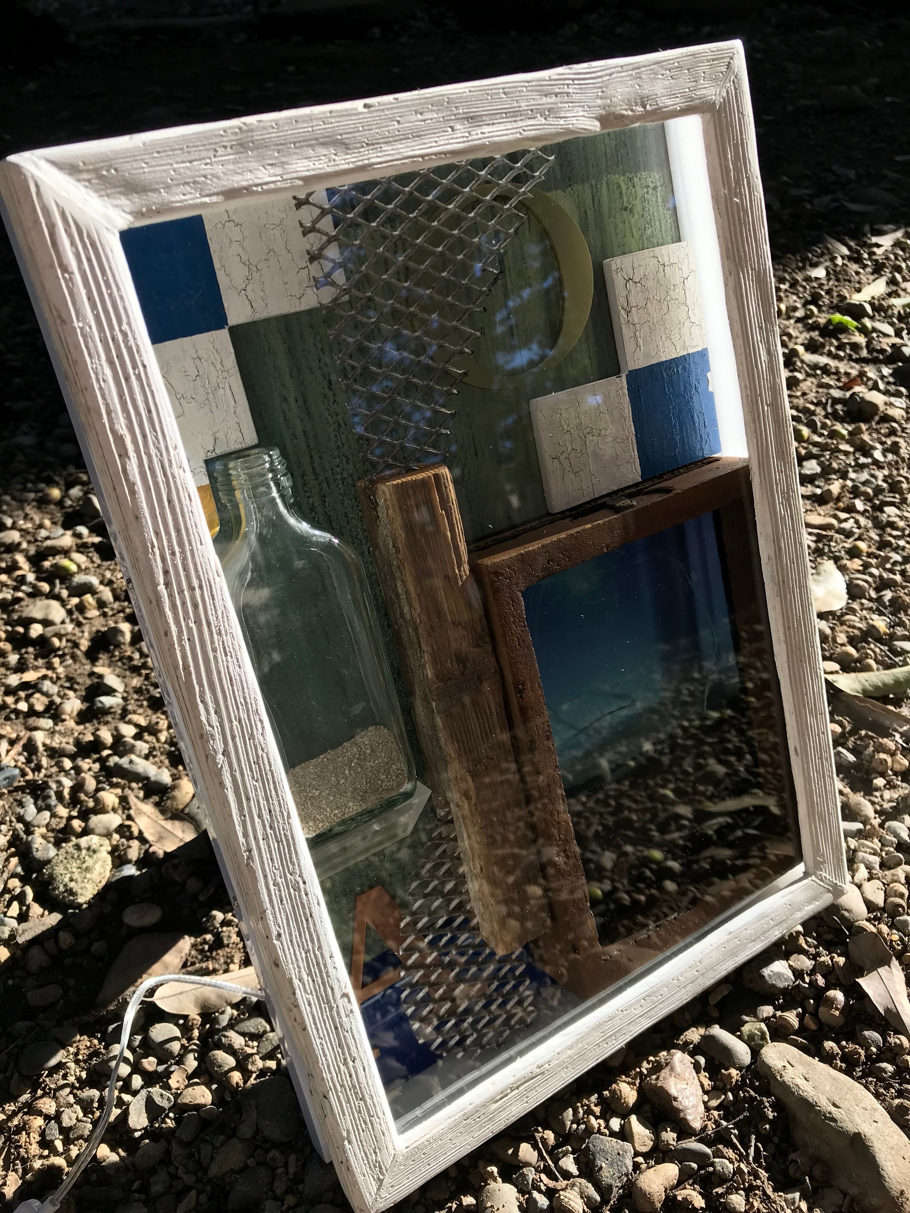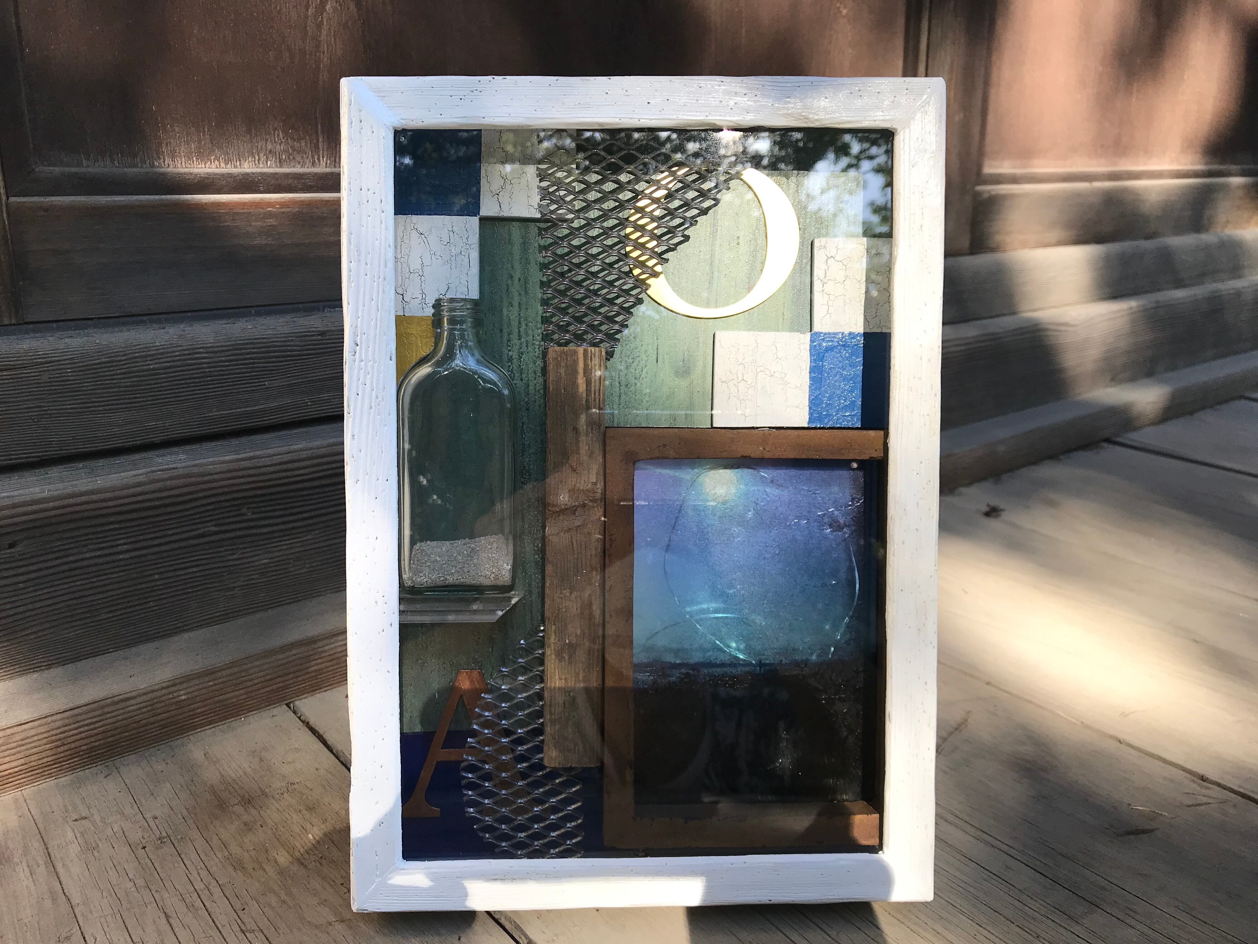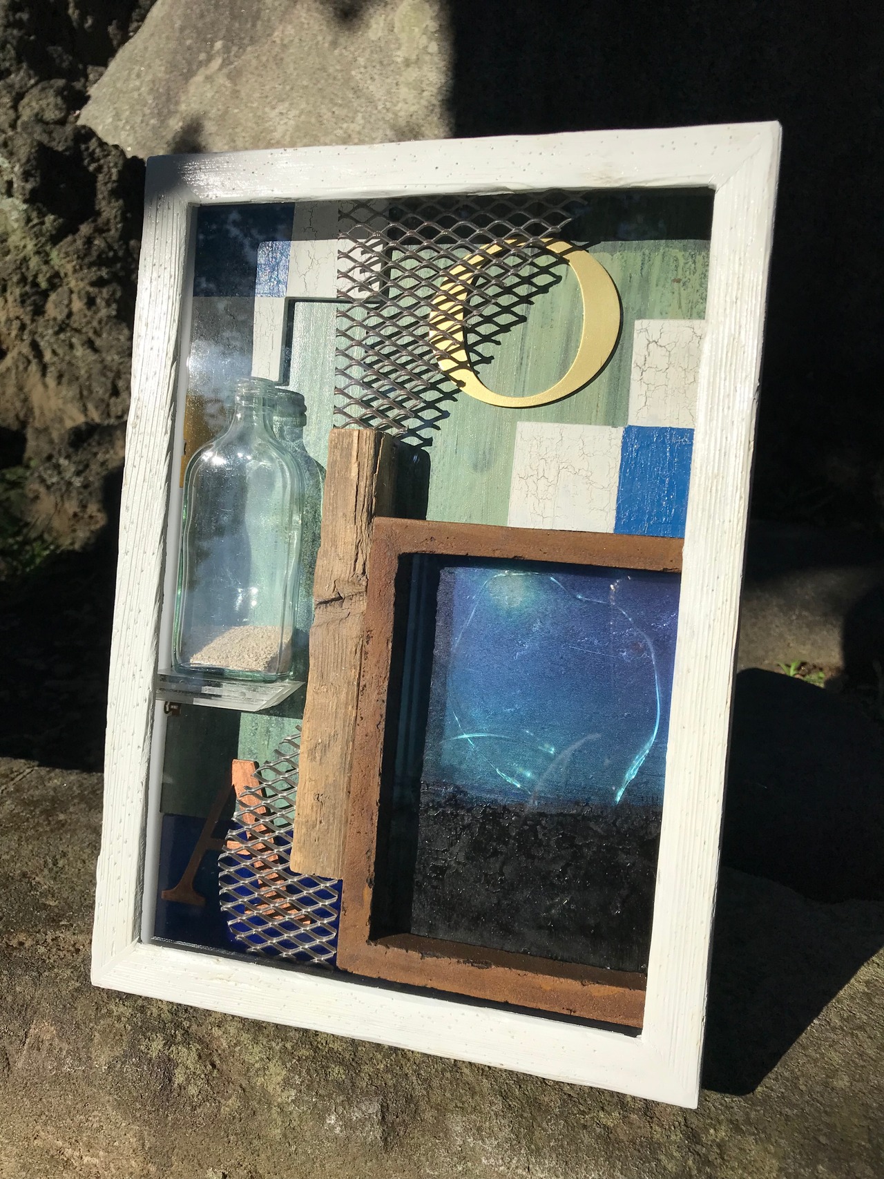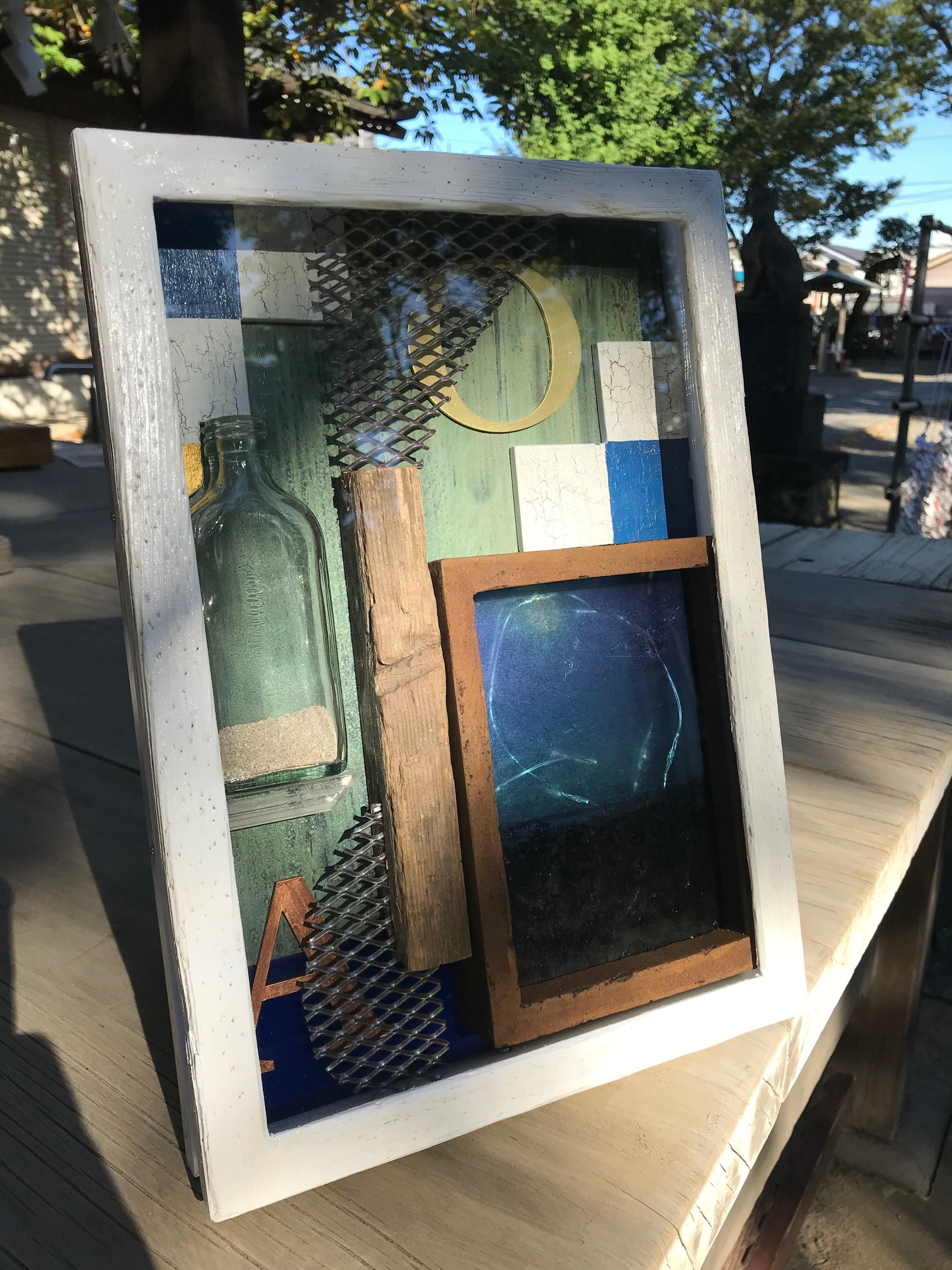 素材:木、ガラス板、ガラス瓶、砂、アクリル板、鉄の網、LED電球、水性塗料、ほか