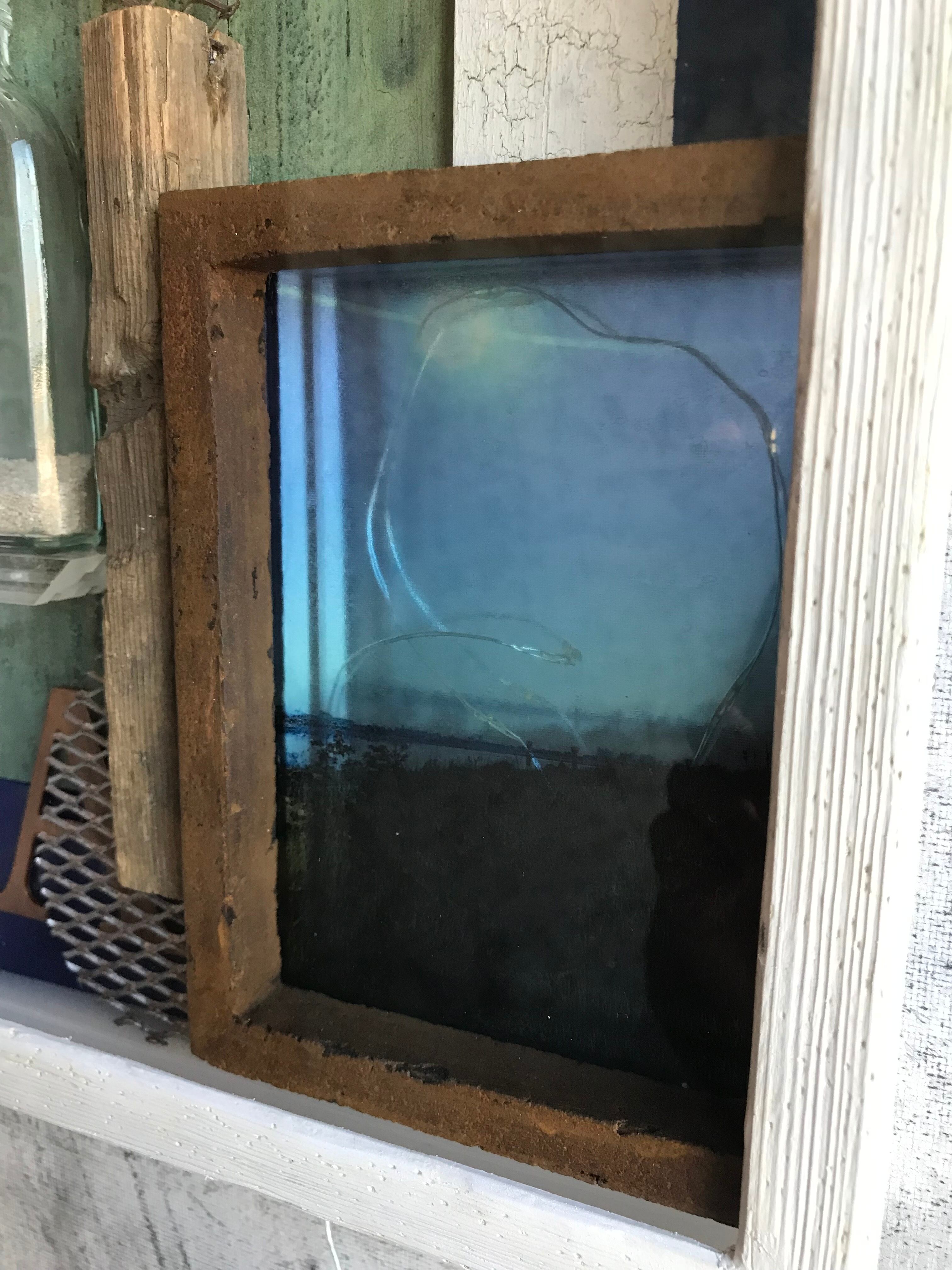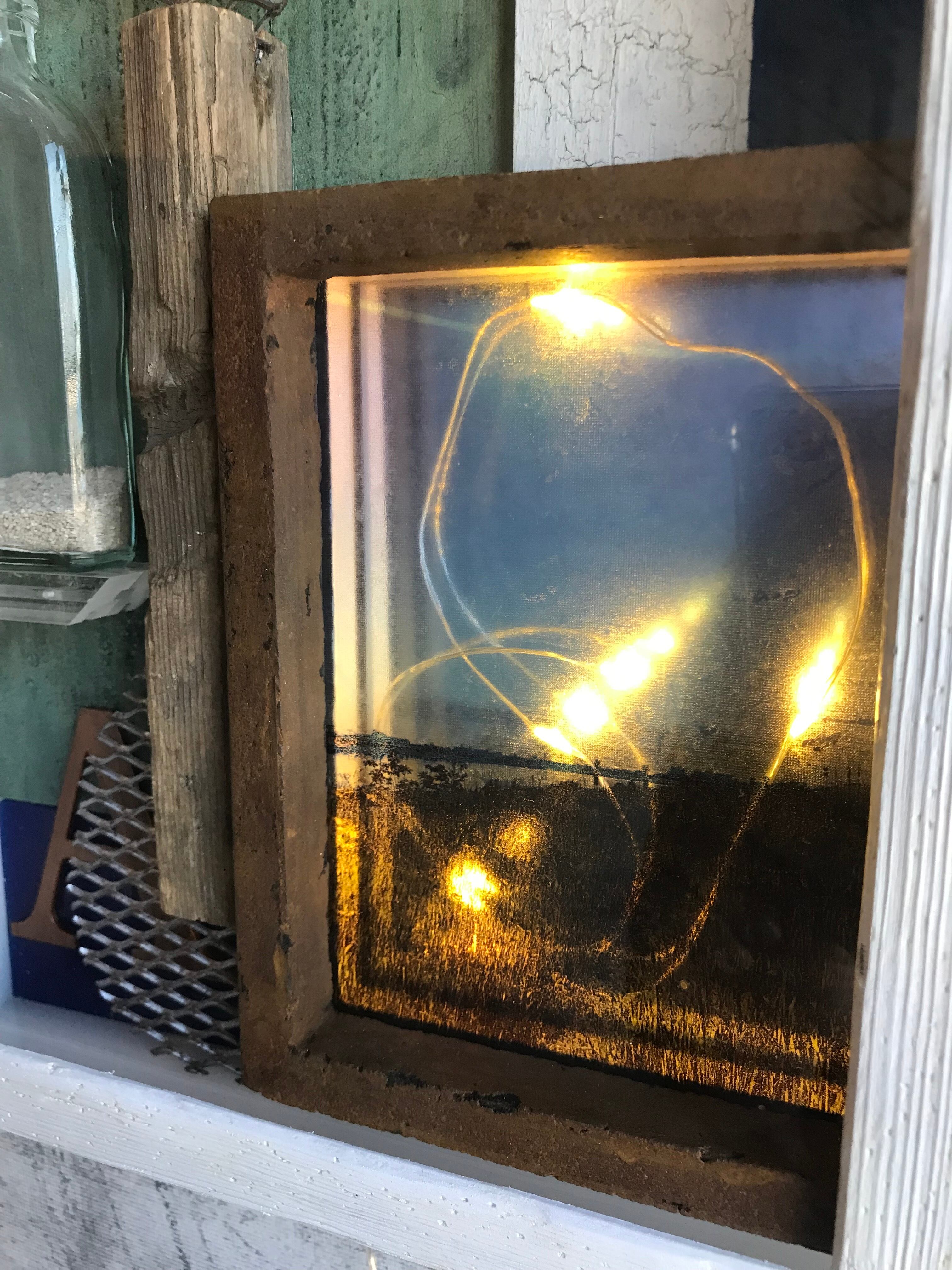 作品内部の鉄サビ色のフレームの中にはLEDの電球が仕込んであり、USB電源で発光します。
